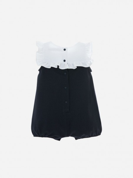 Dieser superschöne Strampler ist aus marineblauem Piqué. Es ist mit einer weißen Piquet-Rüsche auf der Brust und zwei hübschen passenden Schleifen verziert. Der Strampler wird zum einfachen Anziehen mit Druckknöpfen zwischen den Beinen und hinten geschlossen.