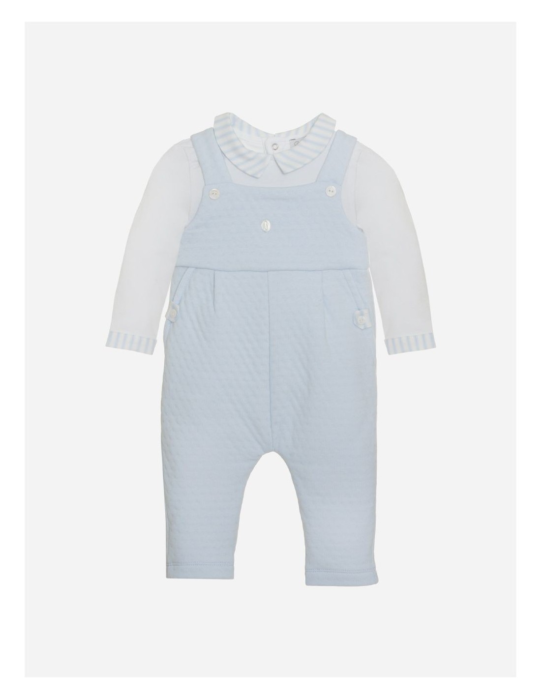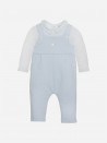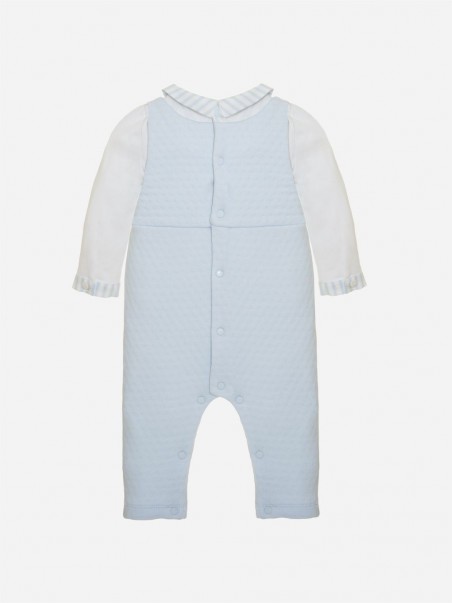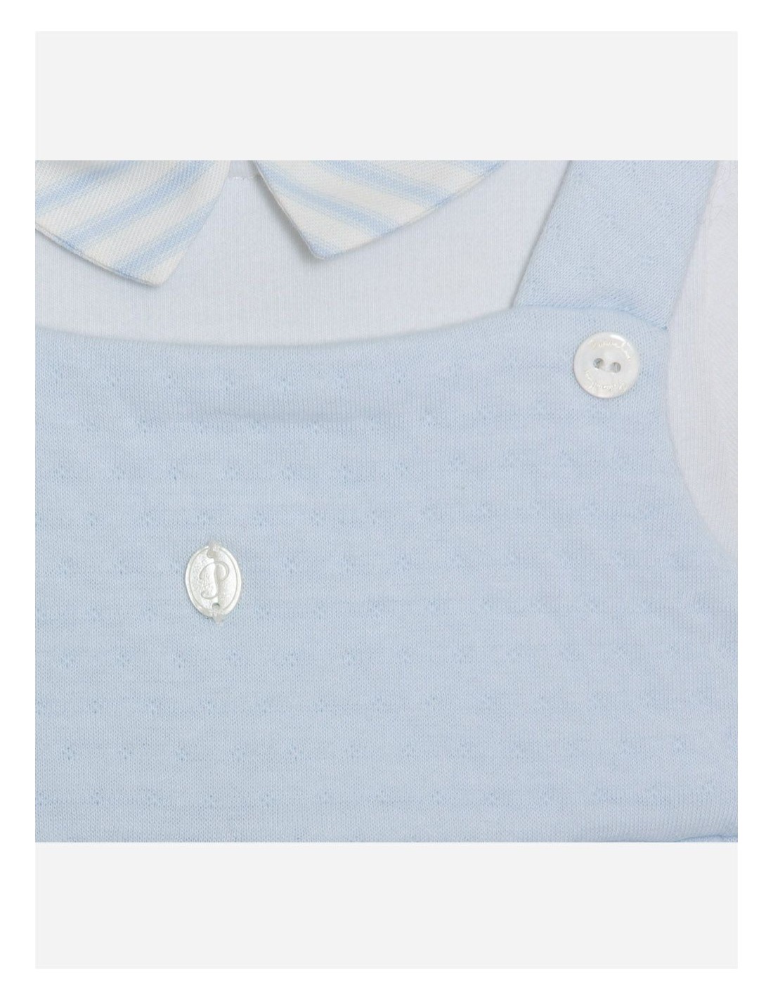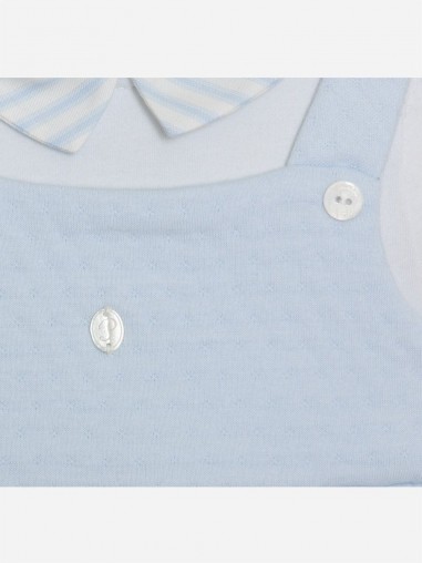 Entzückender Overall aus zwei Teilen aus wunderschönem blau-weißem Jersey. Das Oberteil ist mit Patachous ovalem Perlmuttknopf verziert.