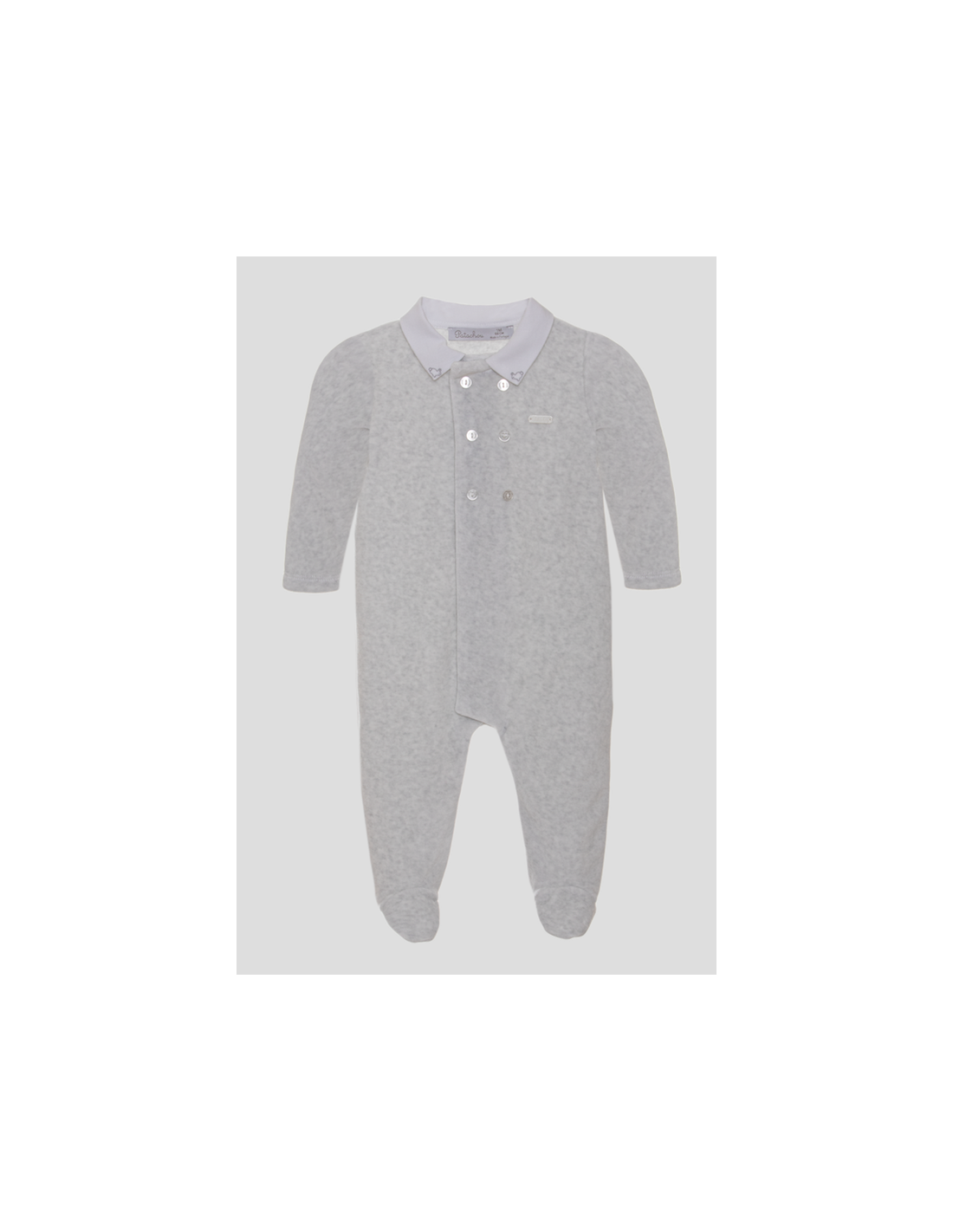 Der kleine Onesie-Pyjama in Perlgrau besteht aus Samt mit weißem Hemdkragen.