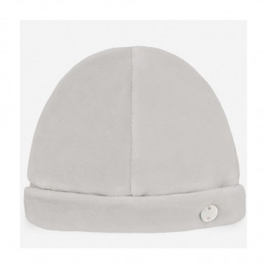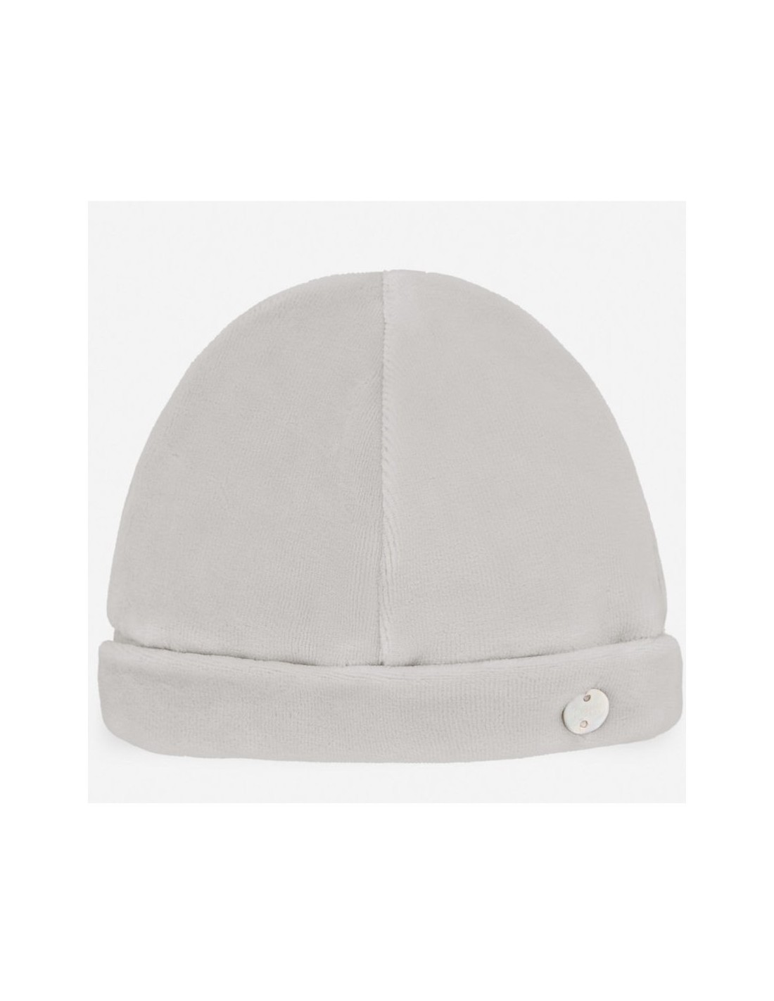Hübsche perlgraue Mütze für Jungen und Mädchen von Paz Rodriguez, hergestellt aus sehr weichem Baumwollsamt mit einem Perlmutt-Logoetikett auf der Vorderseite.