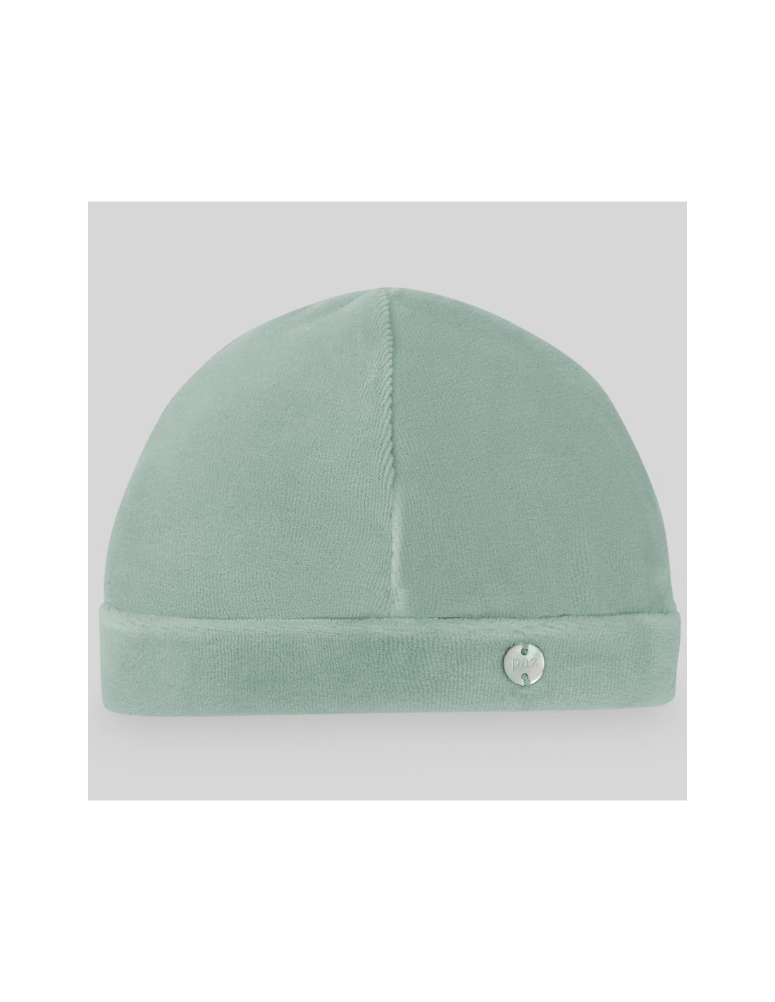 Hübsche smaragdgrüne Mütze für Jungen und Mädchen von Paz Rodriguez, hergestellt aus sehr weichem Baumwollsamt mit einem Perlmutt-Logoetikett auf der Vorderseite.