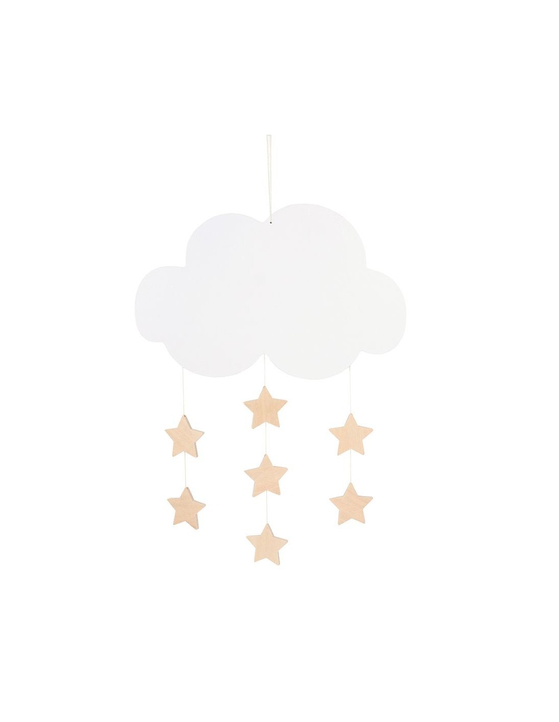 Dekoratives Babybett-Mobile aus Holz in Form einer Wolke mit kleinen Sternen. Hängen Sie es als schöne Dekoration an eine beliebige Stelle im Kinderzimmer.