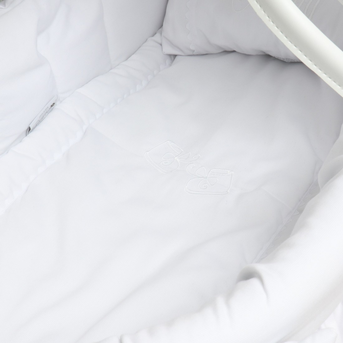 Der Bezug aus weißer Piqué-Baumwolle wird durch die kleinen Schleifen aufgewertet, die ihm einen Hauch von Eleganz verleihen. Sein schlangenförmiger Zopfabschluss krönt das Ganze.