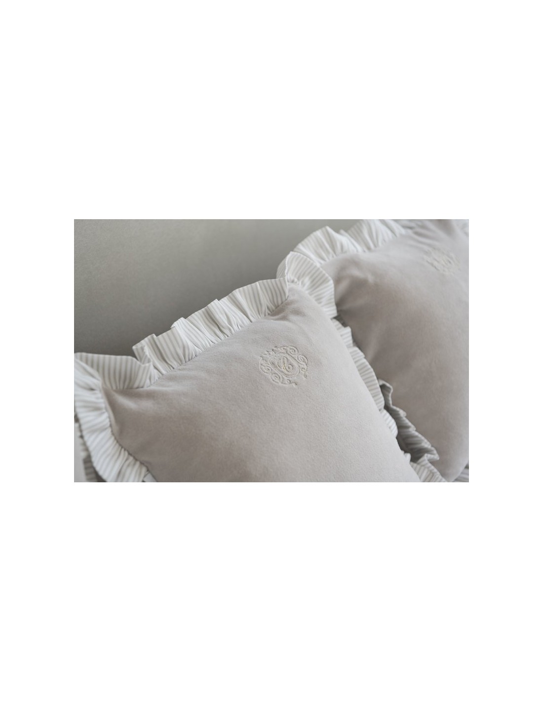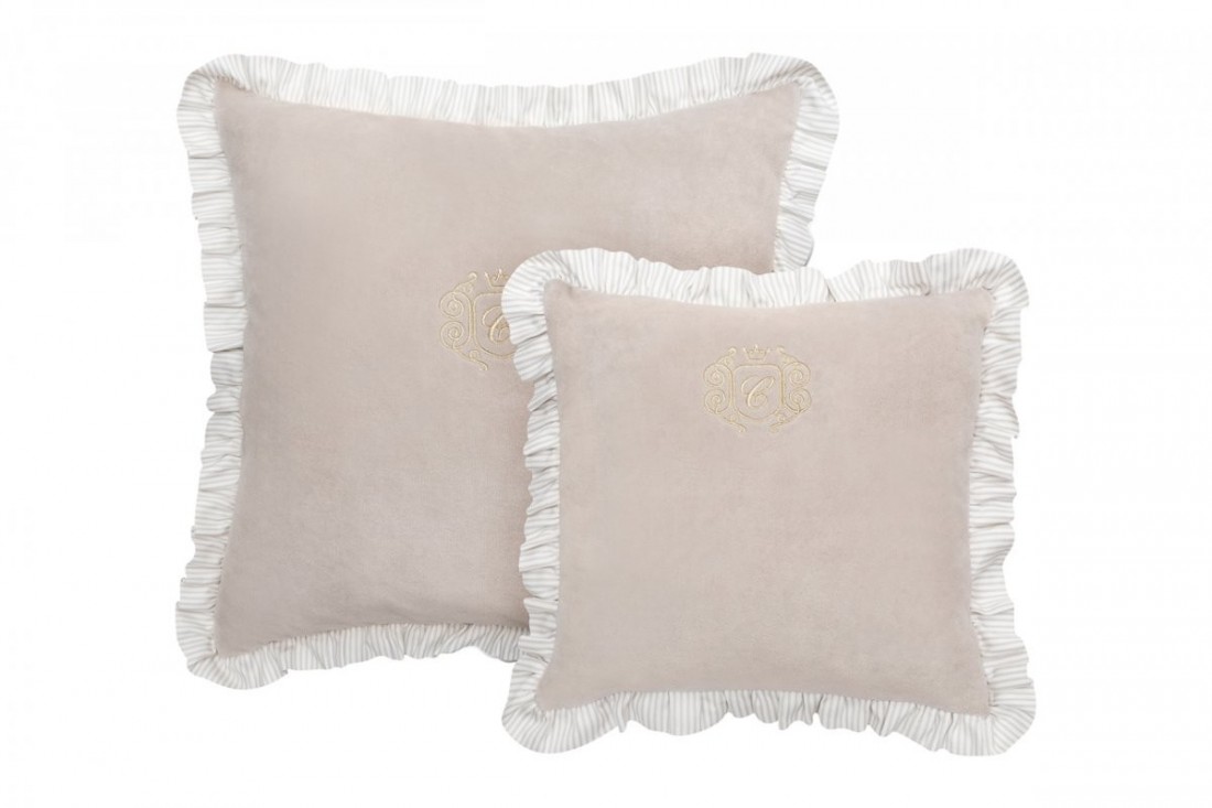 Entzückendes Kissen aus weichem beigem Samt. Es war mit einem eleganten goldenen Emblem verziert.