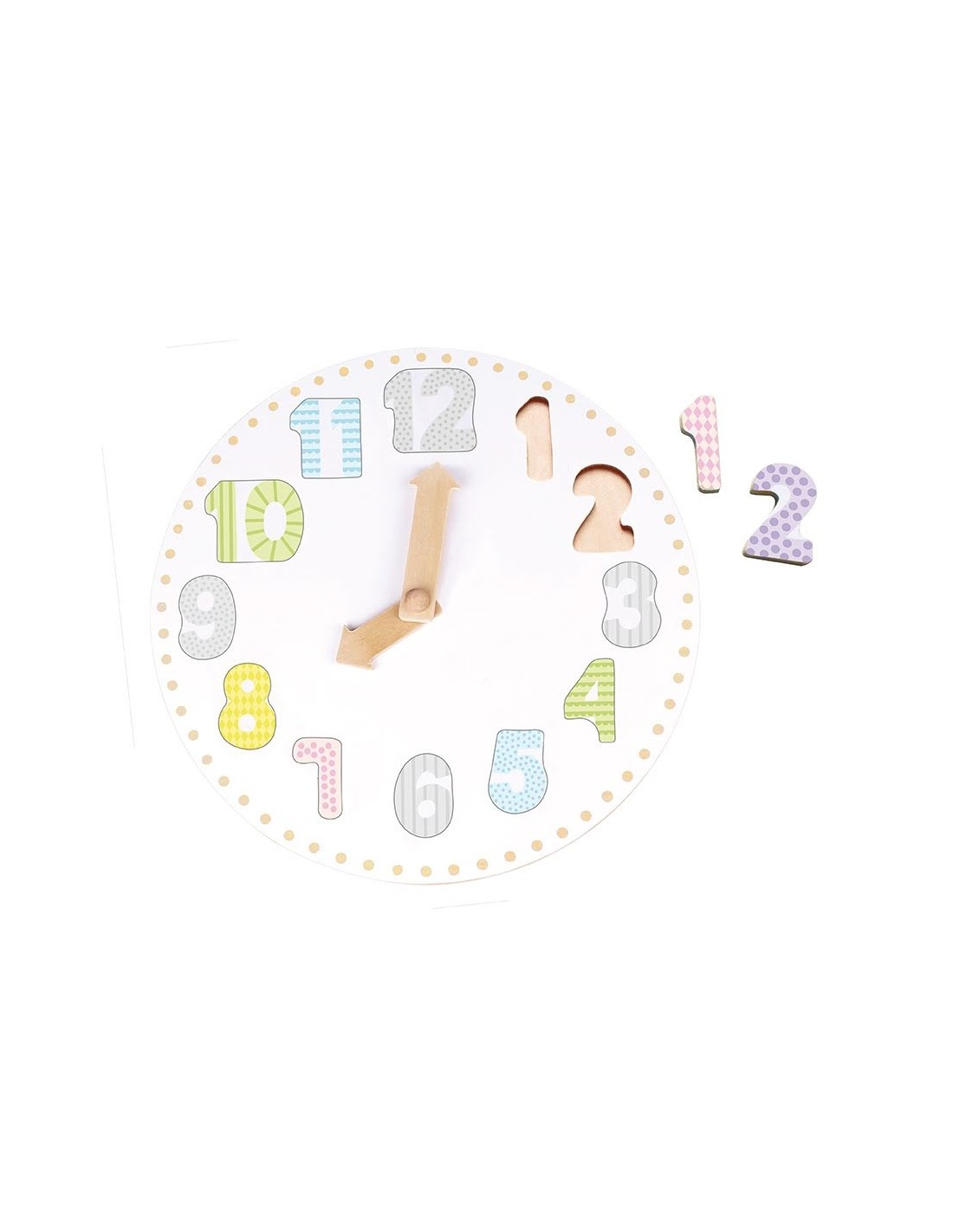 Uhrenpuzzle aus Holz in hellen Pastelltönen. Mit diesem Uhrenpuzzle können Kinder die Uhrzeit auf neue und unterhaltsame Weise lernen.