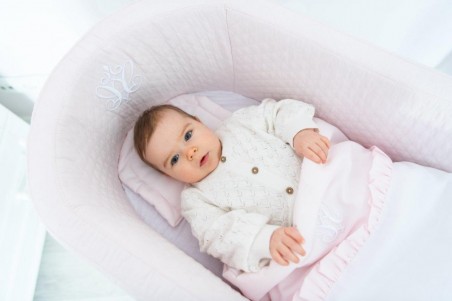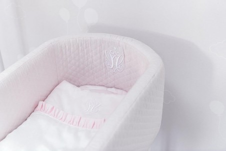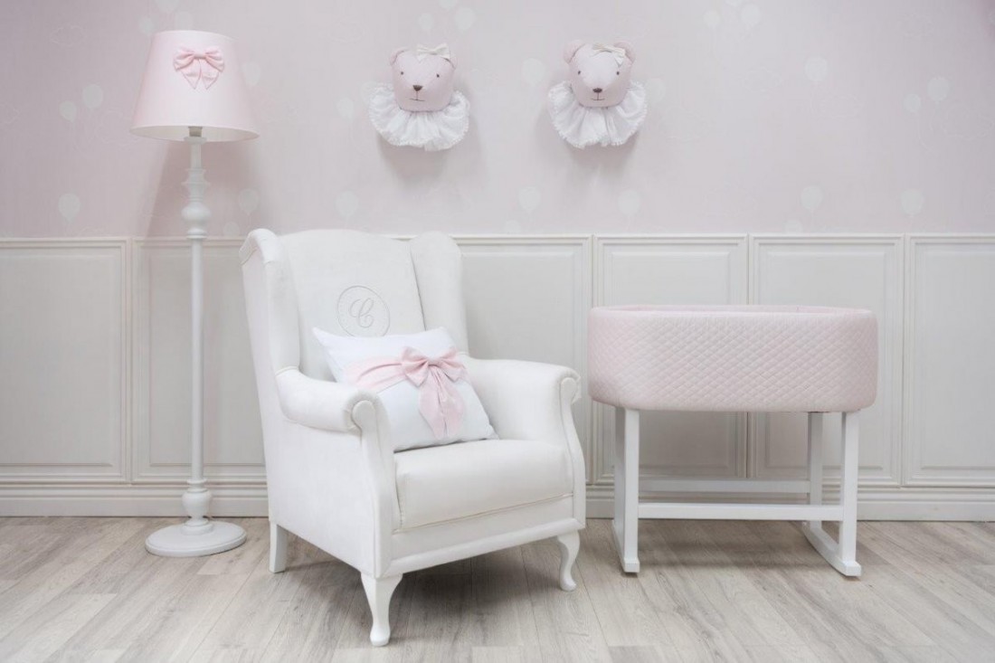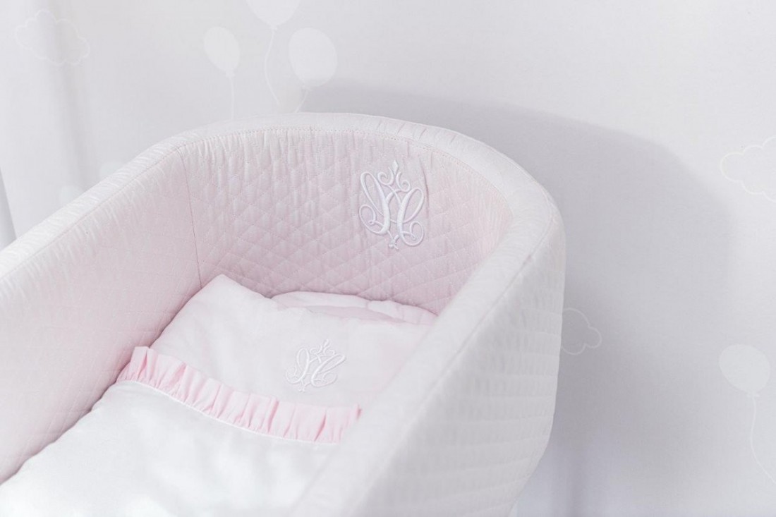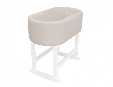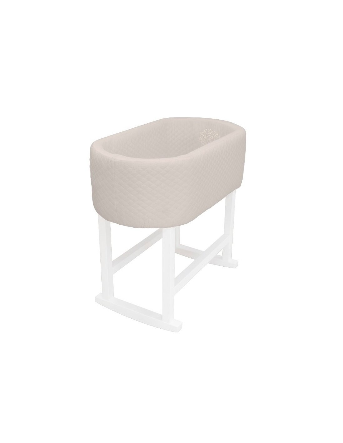Eine elegante Wiege, gepolstert mit beigem, gestepptem Samt und verziert mit goldener Stickerei. Diese gemütliche Wiege bietet dem Kind ein sanftes Schaukeln und damit einen ruhigen Schlaf.