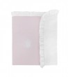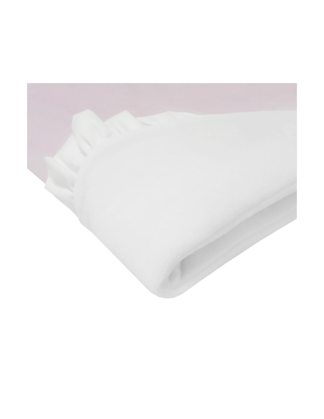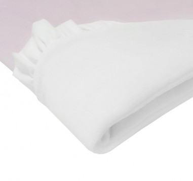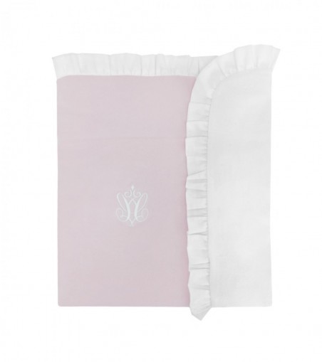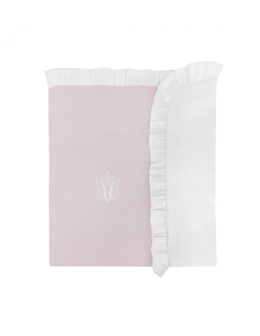 Eine bezaubernde Samtdecke in zartem Puderrosa. Verziert mit einer dekorativen Rüsche und einem eleganten Emblem. Es ist eine hervorragende Ergänzung zur Babyausstattung für ein Mädchen und eine gute Geschenkidee für ein Kind.