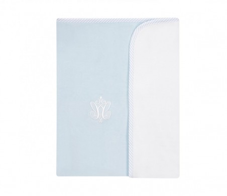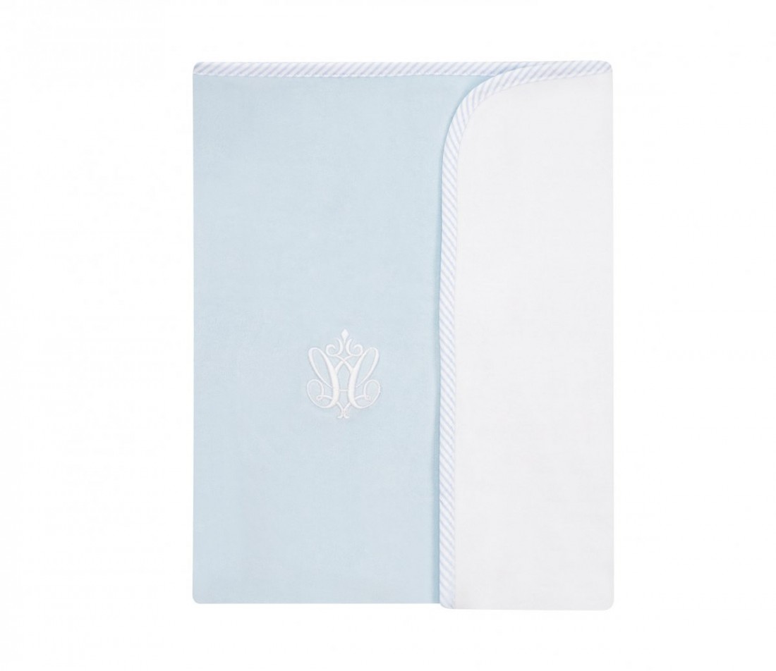 Ein bezaubernder Samtbezug in zartem Weiß und Himmelblau. Verziert mit einem eleganten Emblem. Es ist eine hervorragende Ergänzung zur Babyausstattung für einen kleinen Jungen und eine gute Geschenkidee für ein Kind.