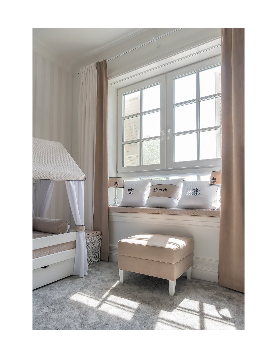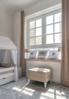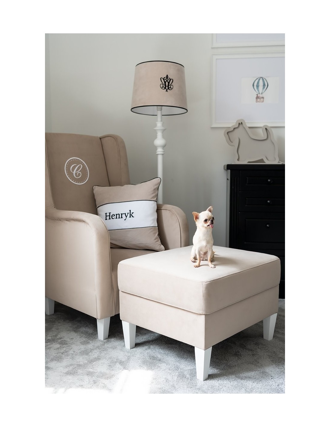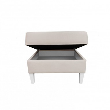 Ein eleganter Sitzpuff aus waschbarem Stoff in Babybeige. Der Ottoman ist gleichzeitig auch ein Koffer – er verfügt über einen aufklappbaren Deckel und Stauraum. Es ist ein wunderschönes Möbelstück für das Kinderzimmer, Schlafzimmer oder Wohnzimmer.