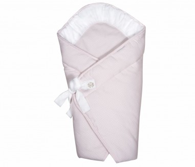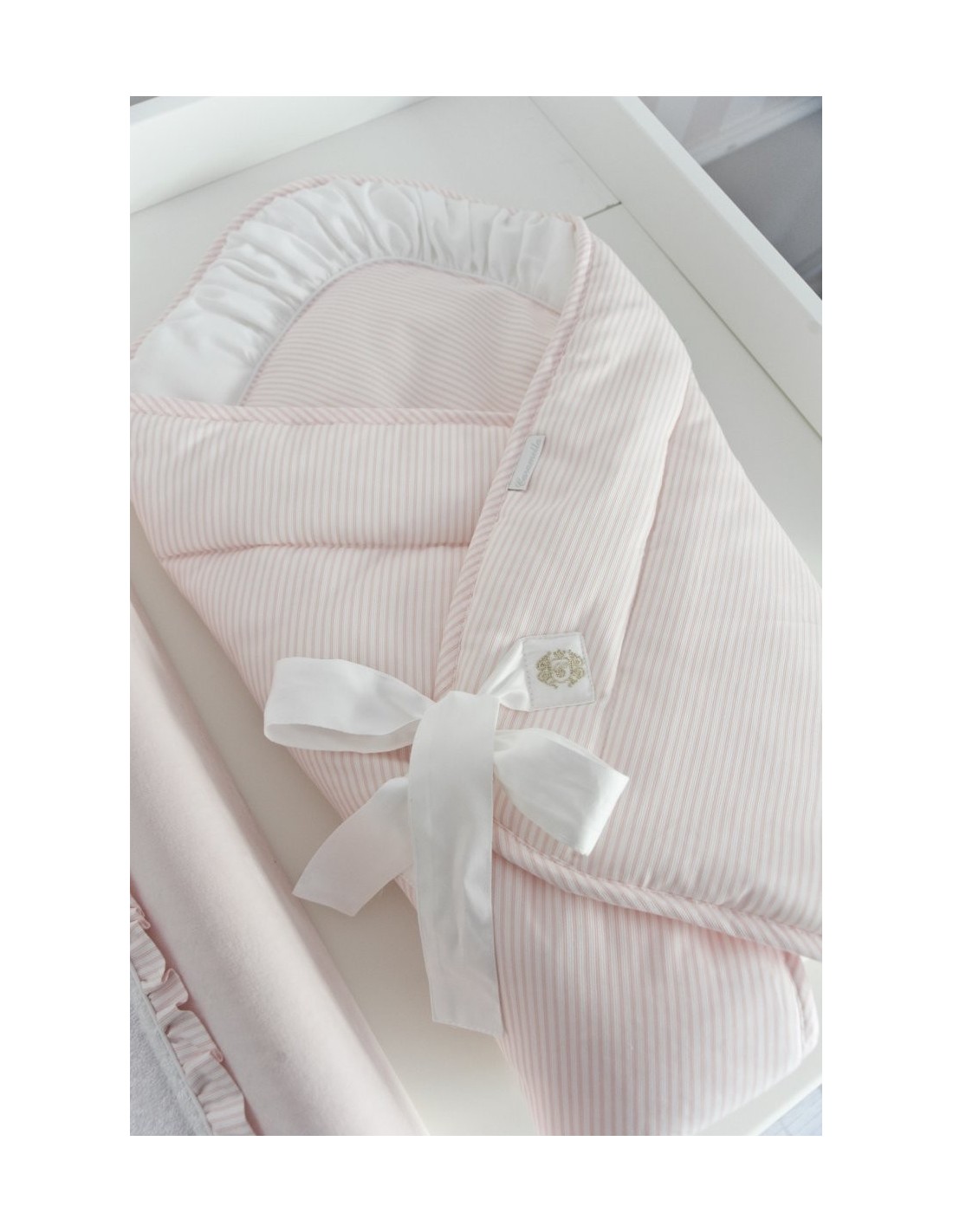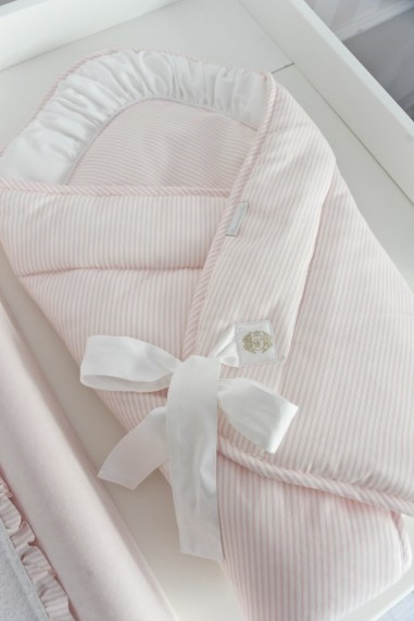 Ein elegantes weiß-rosa Schlafnest aus gestreiftem Stoff mit weißen Falten, verziert mit einer weißen Schleife mit einem kleinen Golden Chic-Emblem. Der Innenteil ist mit Vliesstoff gefüllt, was ihn sehr warm und bequem macht. Es hat keine Versteifungselemente und kann als Sommerbettdecke verwendet werden.