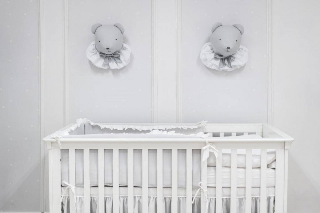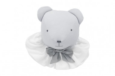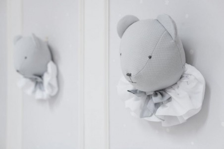 Eine wunderschöne Wanddekoration für ein Kinderzimmer – ein handgefertigter Teddybärkopf, verziert mit einer Halskrause und einer Schleife. Das Produkt verfügt über Schlaufen zum Aufhängen.