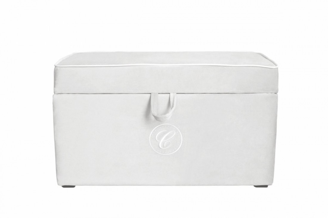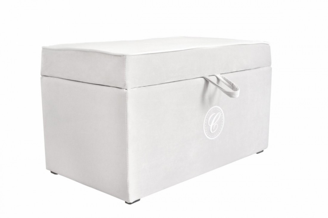 Eine elegante und funktionelle Truhe mit hochwertigem, waschbarem, elfenbeinfarbenem Textilbezug. Es ist mit weißem Kordelbesatz und einem exklusiven Emblem mit dem Buchstaben „C“ verziert. Der sehr geräumige Kofferraum hilft Ihnen, Spielzeug und andere Accessoires im Zimmer Ihres Babys aufzubewahren.