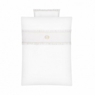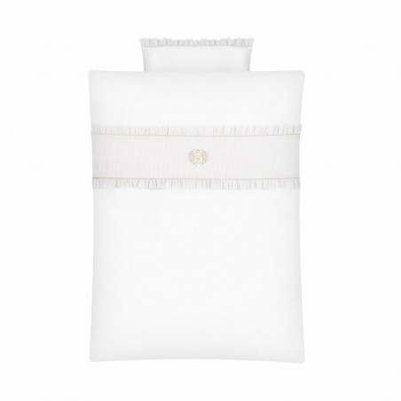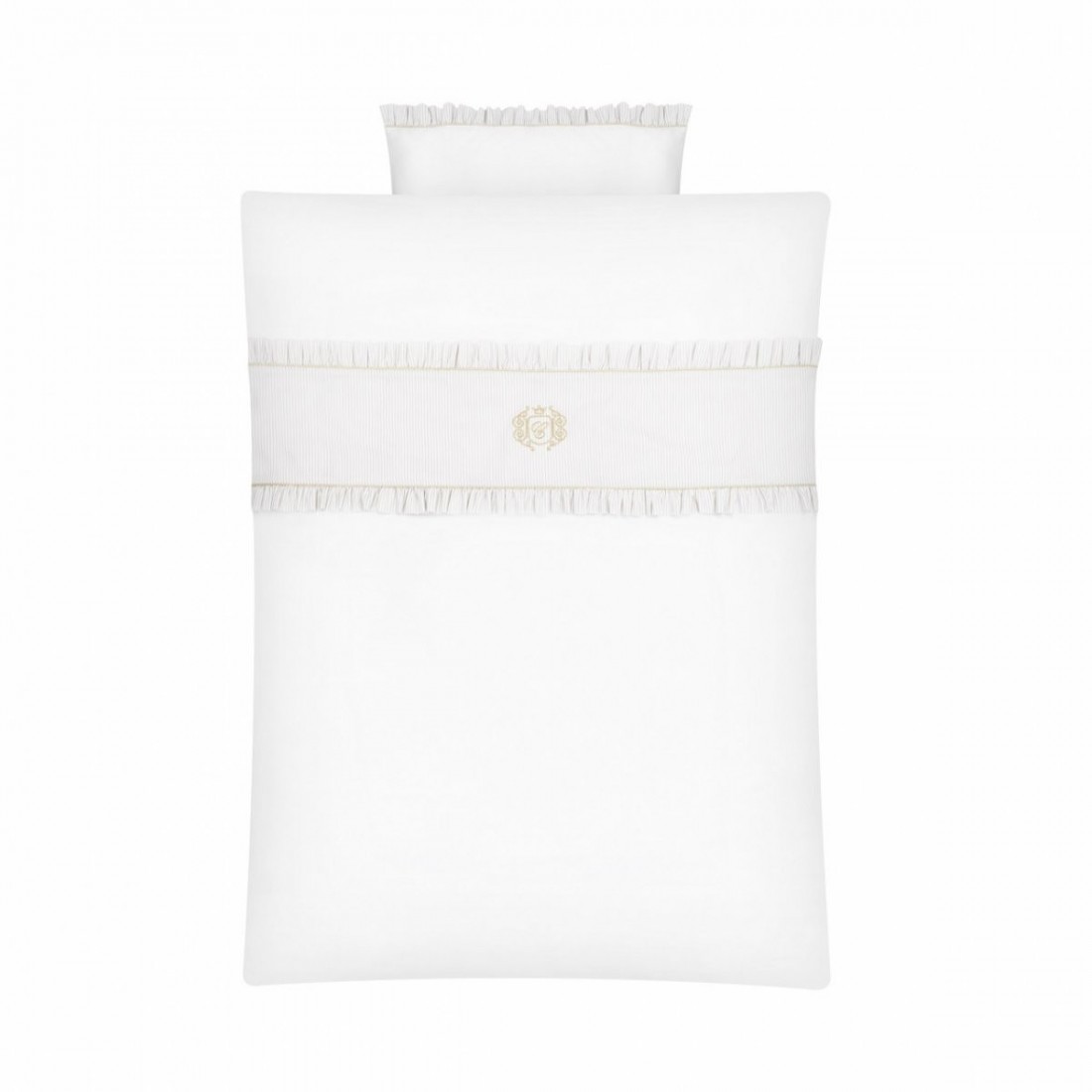 Wunderschöne Bettwäsche aus weißer Satin-Baumwolle mit weiß-beige gestreiftem Einsatz und Kissen. Es verfügt über ein elegantes goldenes Emblem und eine bezaubernde Rüsche. Das Produkt kann ein perfektes Geschenk sein.