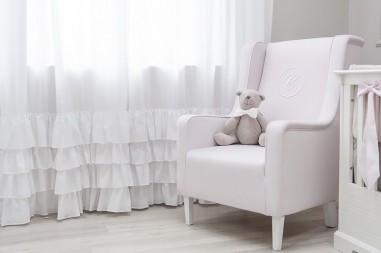 Ein großer, sehr bequemer Ohrensessel im modernen Stil, hergestellt aus hochwertigem, waschbarem Stoff in Babyrosa. Der Sessel ist mit einem grauen Kordelbesatz und einem exklusiven Emblem mit dem Buchstaben „C“ verziert. Unser Stillstuhl wird wegen seiner „Ohren“ und der hohen Rückenlehne von allen stillenden Müttern geschätzt. Darüber hinaus wird es jedes Interieur bereichern – Kinderzimmer, Wohnzimmer und andere.