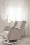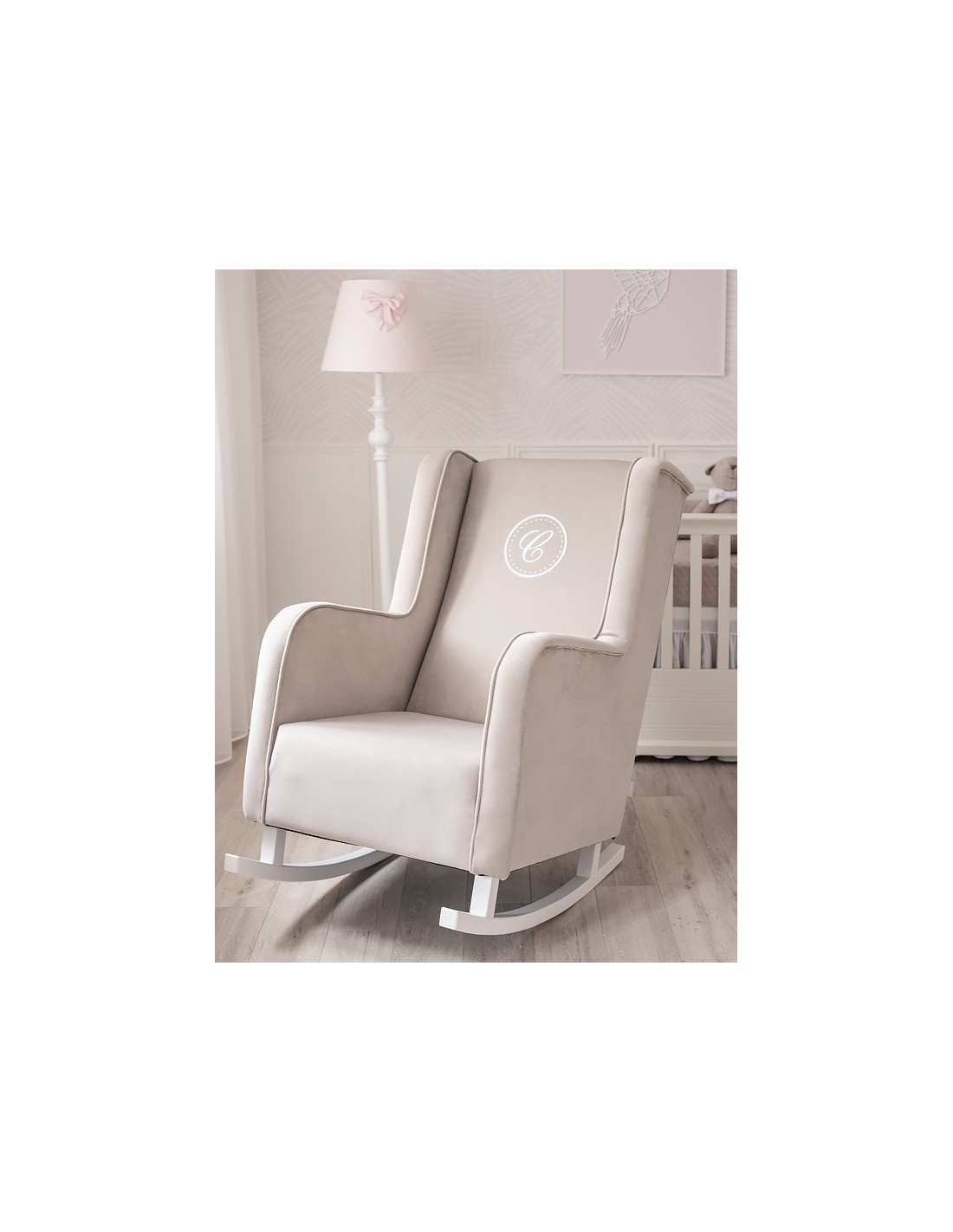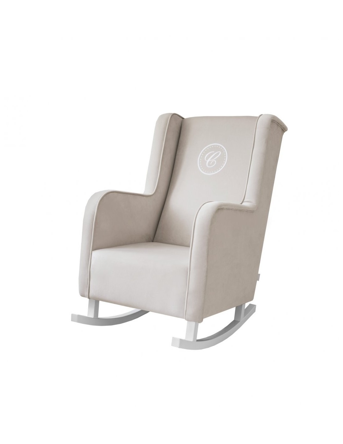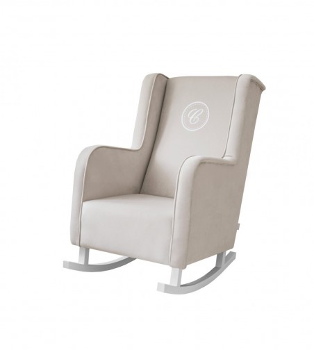 Ein großer, sehr bequemer Schaukelstuhl im modernen Stil, Typ „Ohren“, aus hochwertigem, waschbarem Textil in der Farbe Beige. Der Sessel ist mit einem grauen Kordelbesatz und einem exklusiven Emblem mit dem Buchstaben „C“ verziert. Unser Stillstuhl wird wegen seiner „Ohren“ und der hohen Rückenlehne von allen stillenden Müttern geschätzt. Darüber hinaus wird es jedes Interieur bereichern – Kinderzimmer, Wohnzimmer und andere.