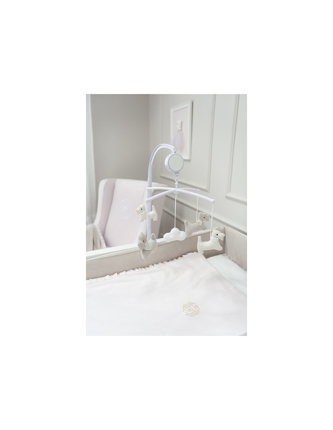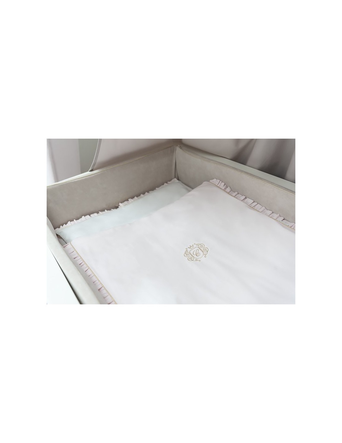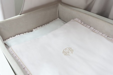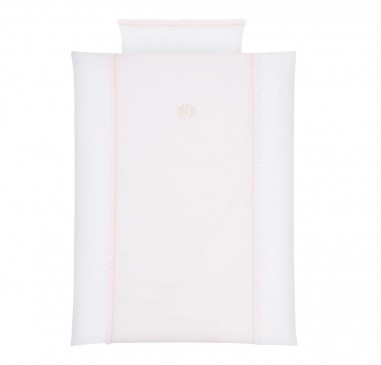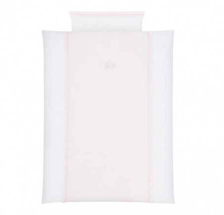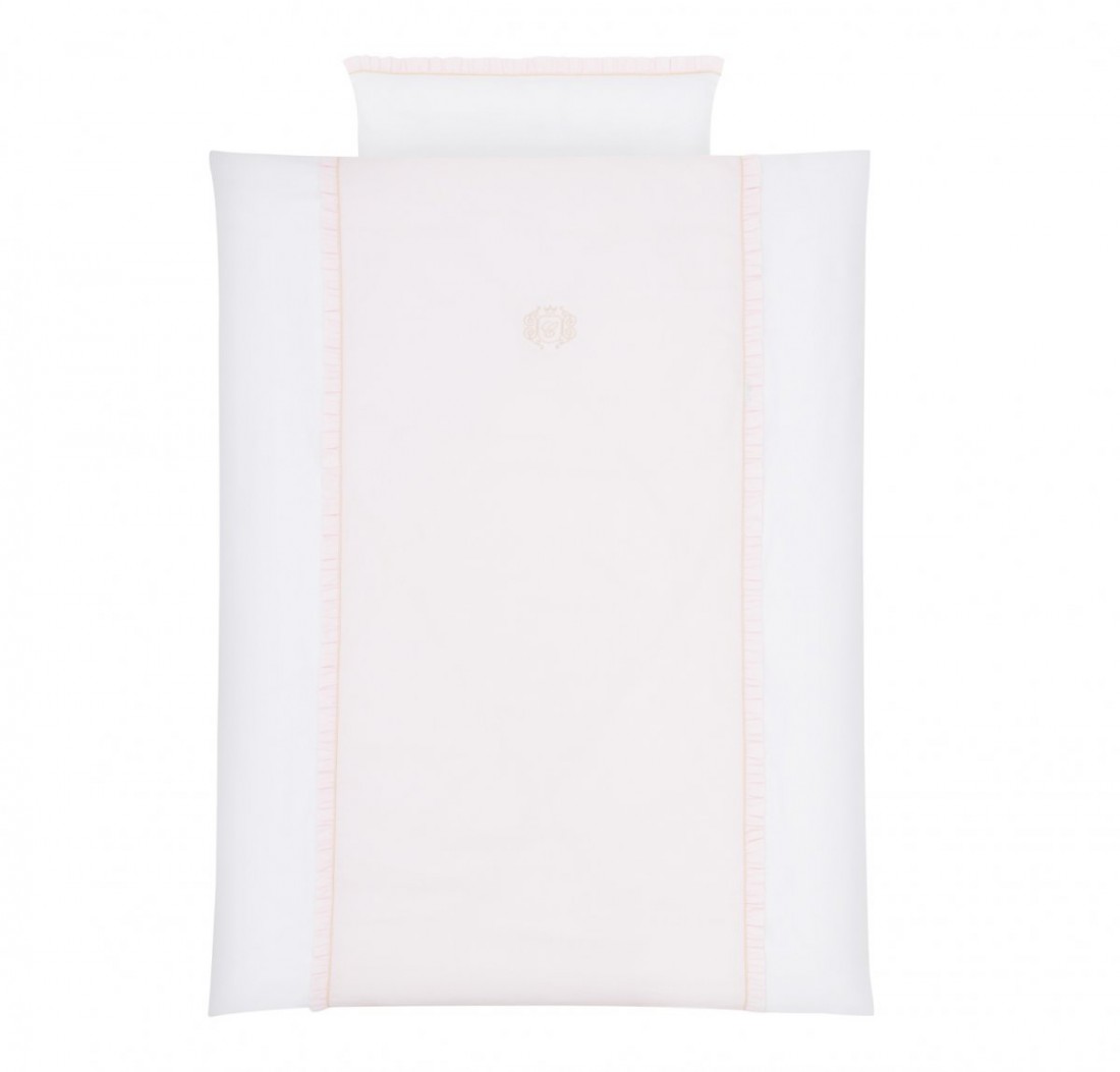 Bettbezug- und Kissenbezug-Set aus der Pastel Chic-Kollektion, komplett aus weißer Satin-Baumwolle und mit einem babyrosa Panel. Es verfügt über ein elegantes goldenes Emblem und eine bezaubernde Rüsche. Dieses Set kann ein perfektes Geschenk sein.
