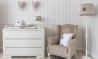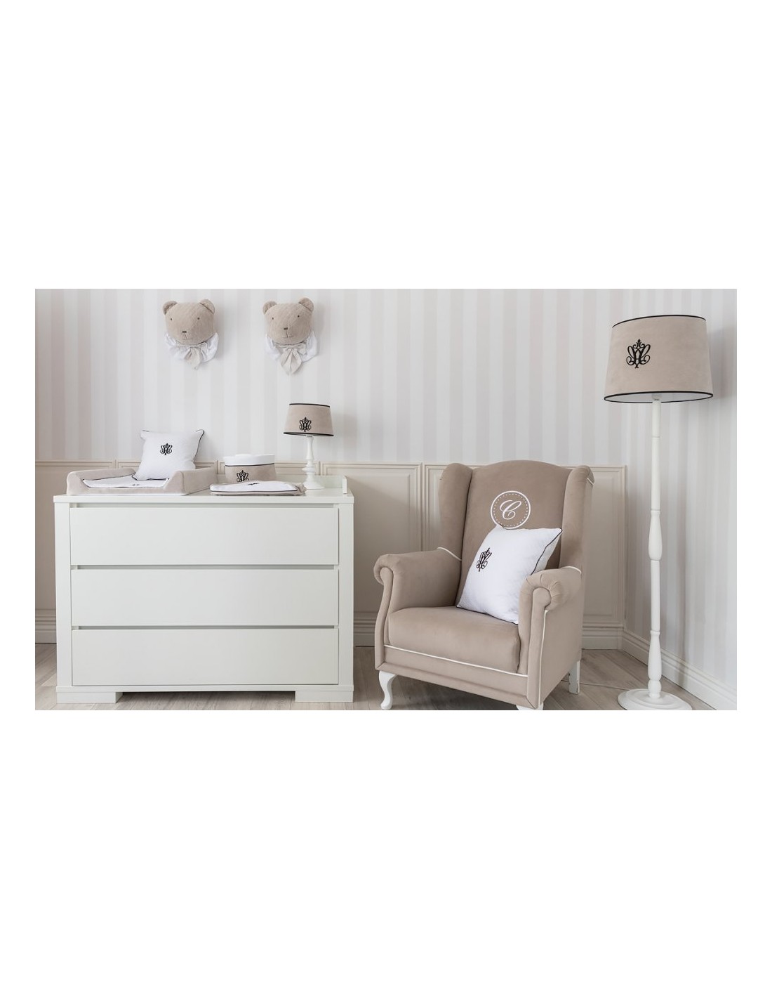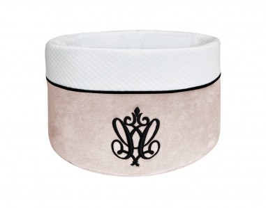 Runder Produktkorb aus gestepptem beigem Samt mit weißem Umschlag, verziert mit einer schwarzen Passe und Stickerei. Der perfekte Ort, um alle Babypflegeprodukte aufzubewahren. Kann auch später zur Aufbewahrung all Ihrer Kleinigkeiten verwendet werden.