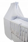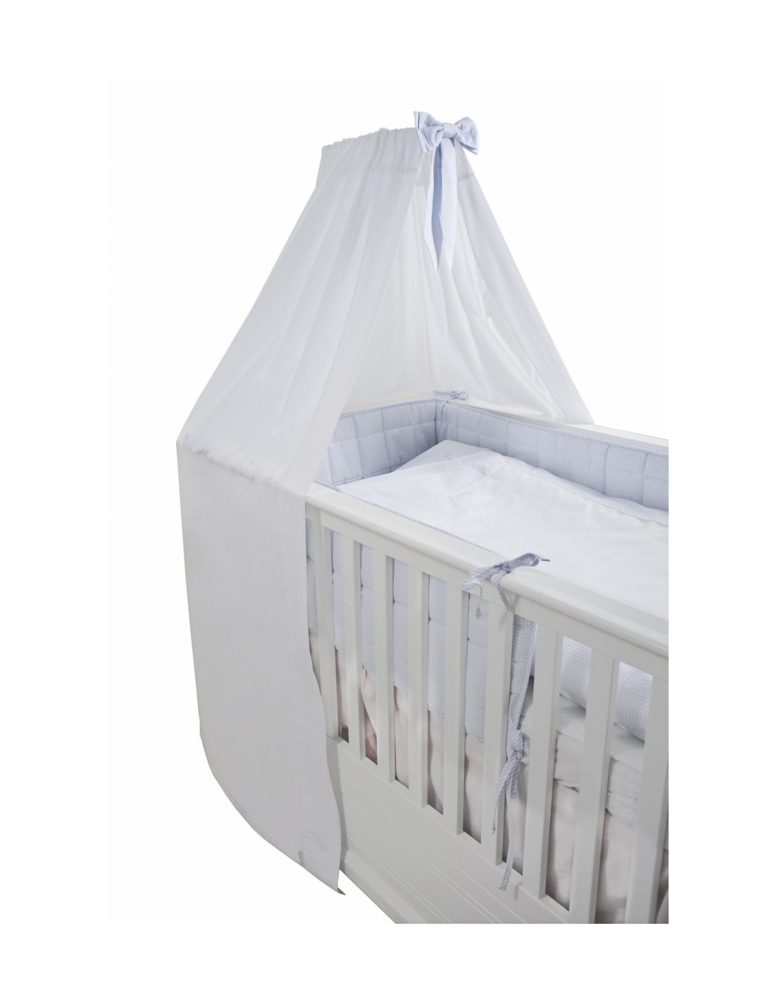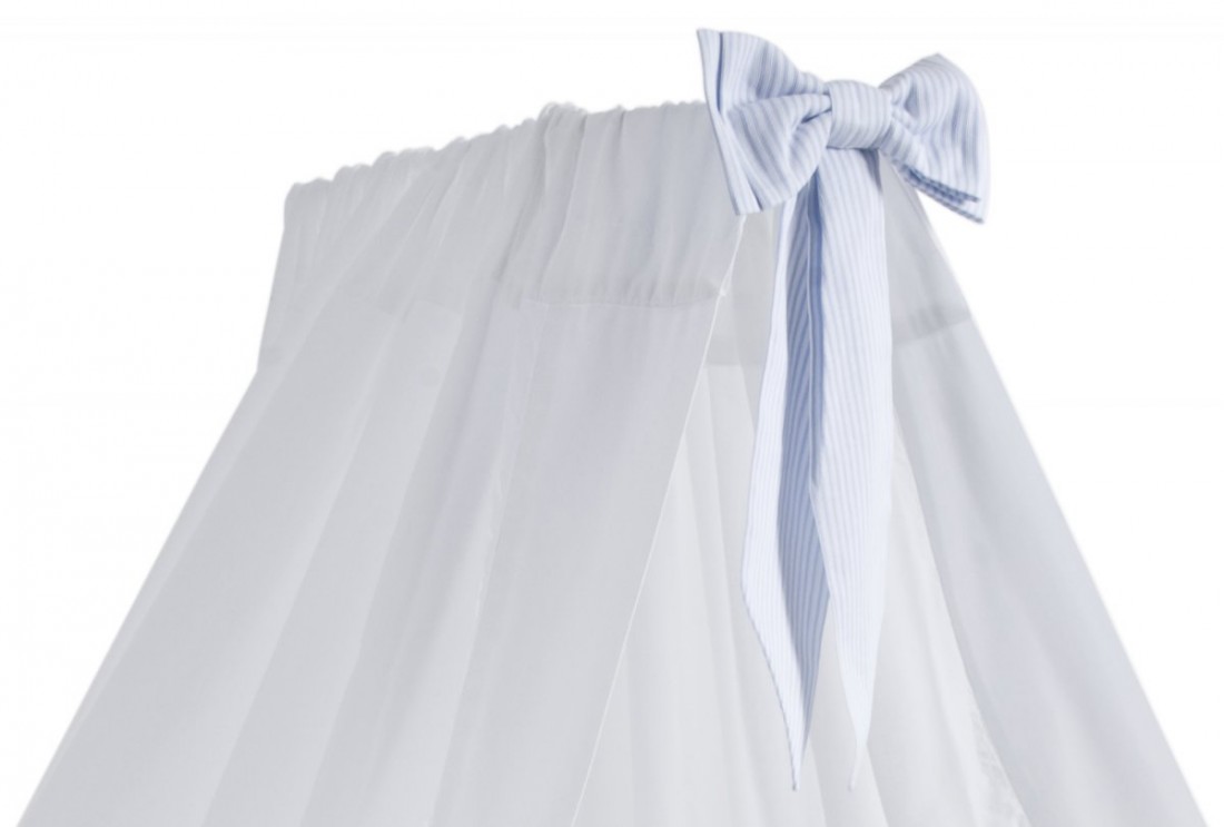 Erhabener freistehender Betthimmel für das Kinderzimmer. Hergestellt aus weißer Satin-Baumwolle und verziert mit einer himmelblau gestreiften Schleife. Der Betthimmel ist ein stilvolles Accessoire, das das Bett Ihres Kindes komfortabler macht und das Baby sich sicherer fühlt.