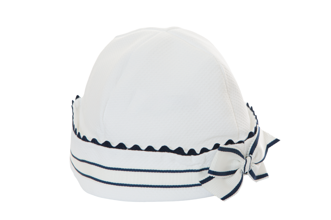 Wunderschöner weißer Piqué-Hut mit einem weiß-marineblau gestreiften Riemen, der in eine schöne Schleife übergeht.