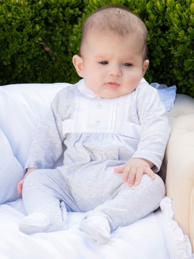 Dieser Pyjama ist in Weiß und Grau mit einem kleinen blauen Finish gefertigt und passt sowohl einem kleinen Prinzen als auch einer kleinen Prinzessin!