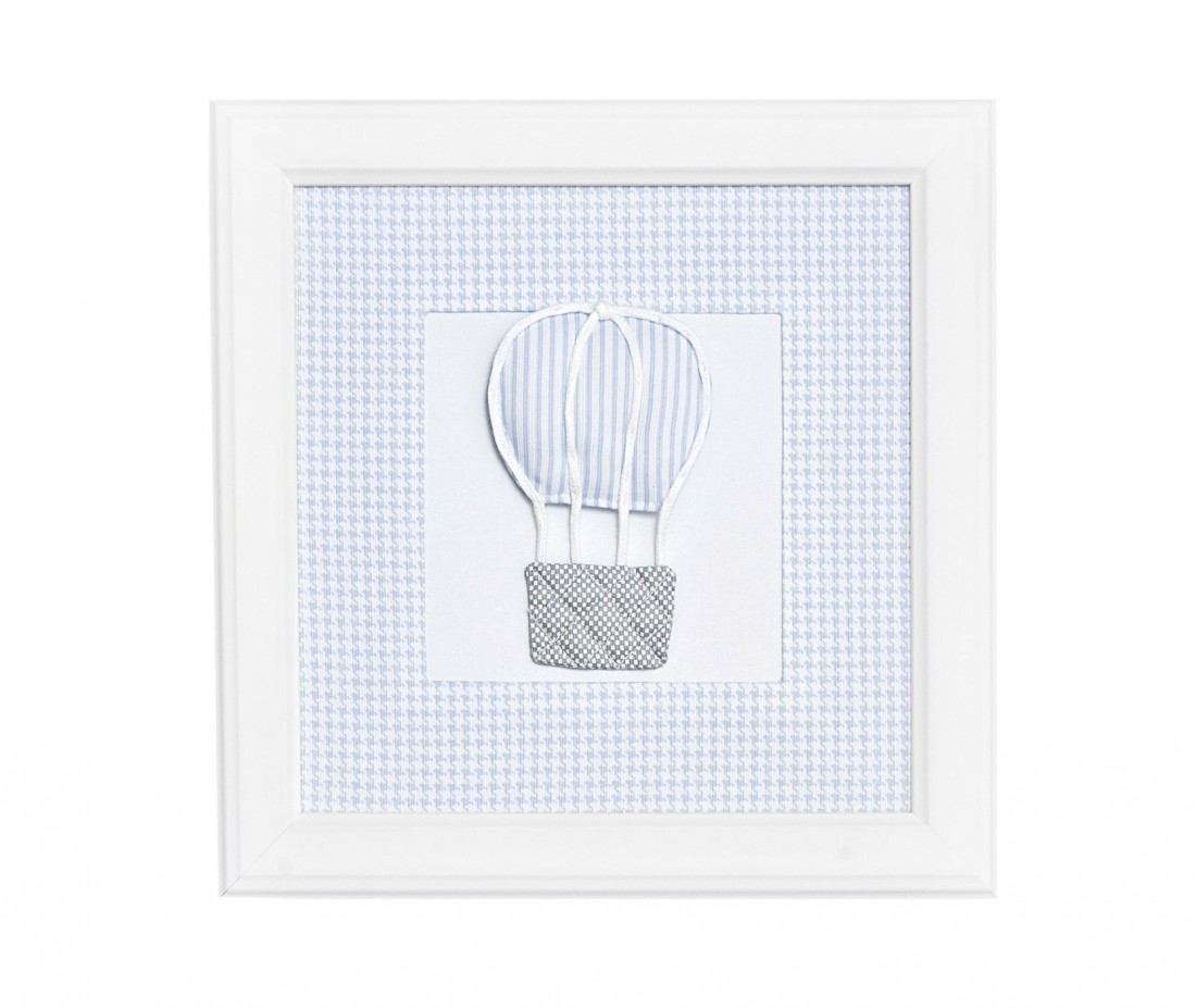 Este marco decorativo consta de un globo aerostático sobre un fondo de cuadros azules en 3D.