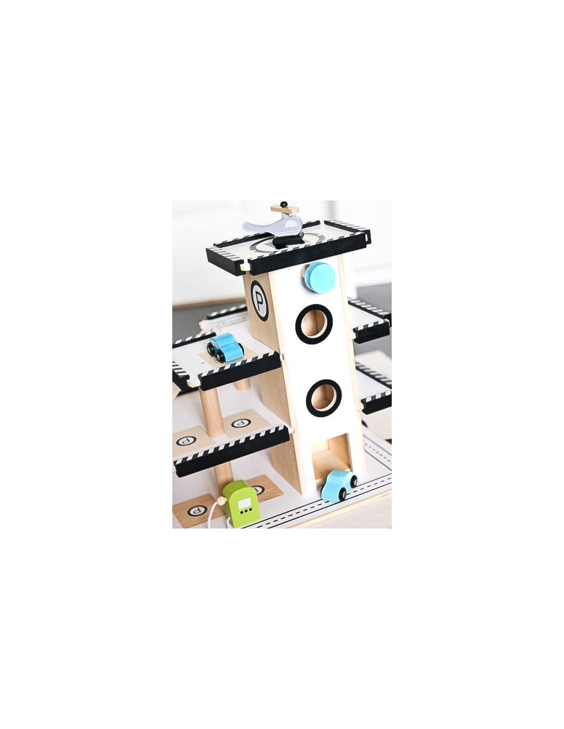 El aparcamiento tiene 3 plantas para aparcar coches y un bonito helipuerto en la azotea. El ascensor tiene un botón de control para que puedas llevar fácilmente los coches a los diferentes pisos.