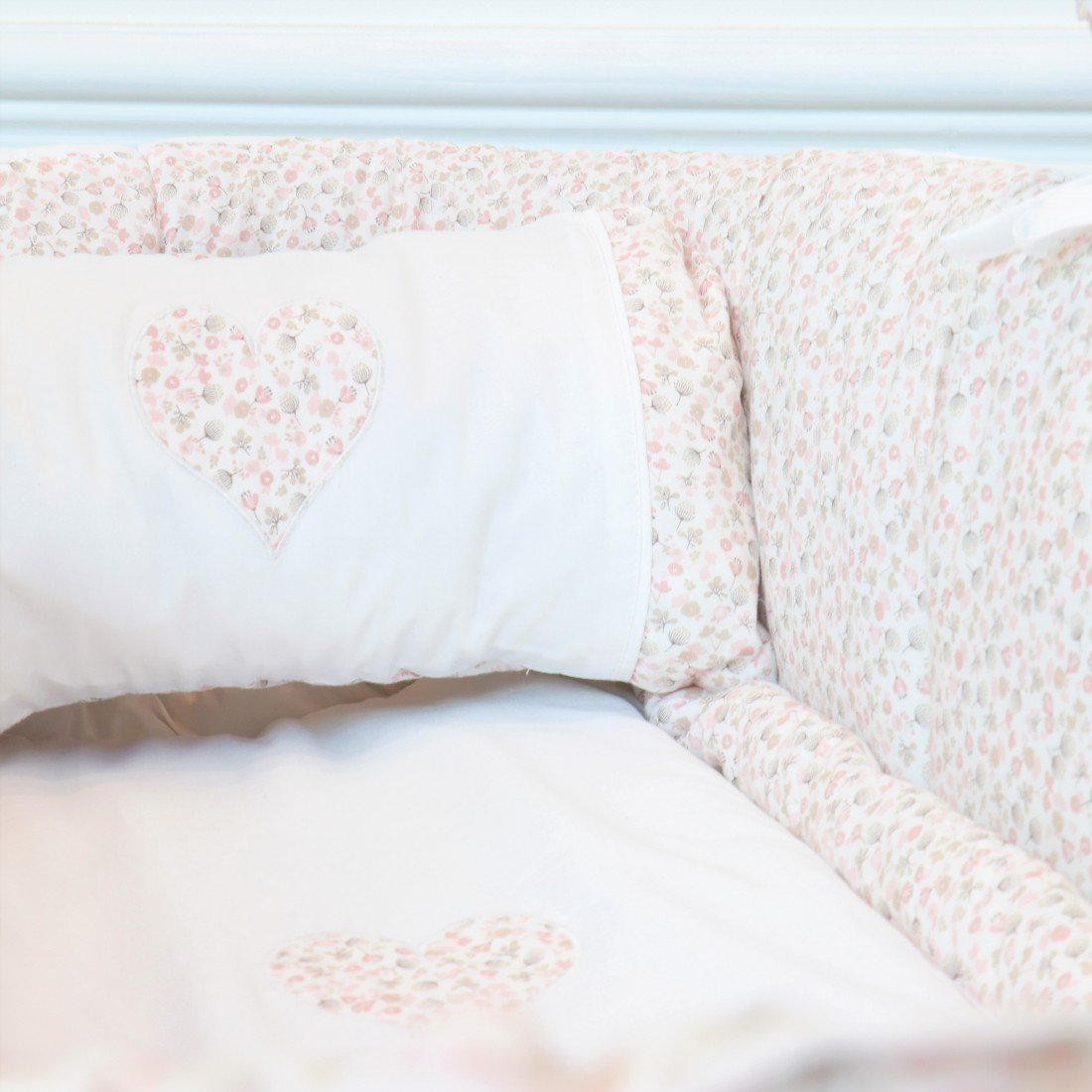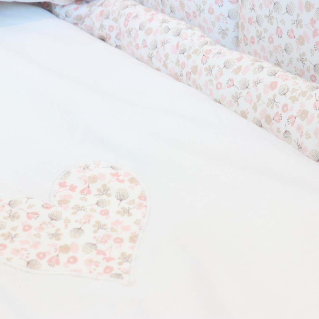 Este modelo surge de una combinación de tejidos liberty y tejidos blancos. En el cojín y en el colchón hay bonitos corazones bordados.