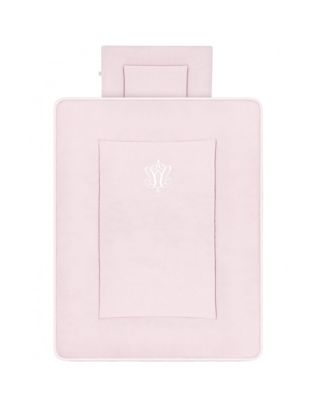 Los primeros juegos de cama para un bebé, ya llenos. Está decorado con un elegante emblema. Es más pequeña que las sábanas normales para bebés, por lo que es perfecta tanto para una cama como para una cuna. La ropa de cama es de tela rosa bebé.