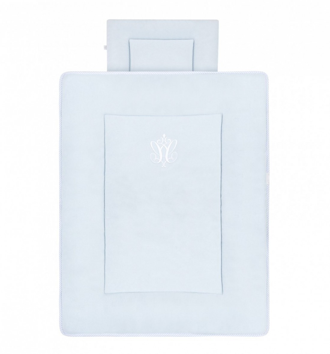 Los primeros juegos de cama para un bebé, ya llenos. Es más pequeña que la ropa de cama estándar para bebés, mientras que es más grande y más gruesa que la ropa de cama mini. El juego de cama está confeccionado en suave terciopelo azul decorado con un elegante bordado en 3D con la letra "C".