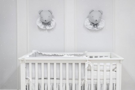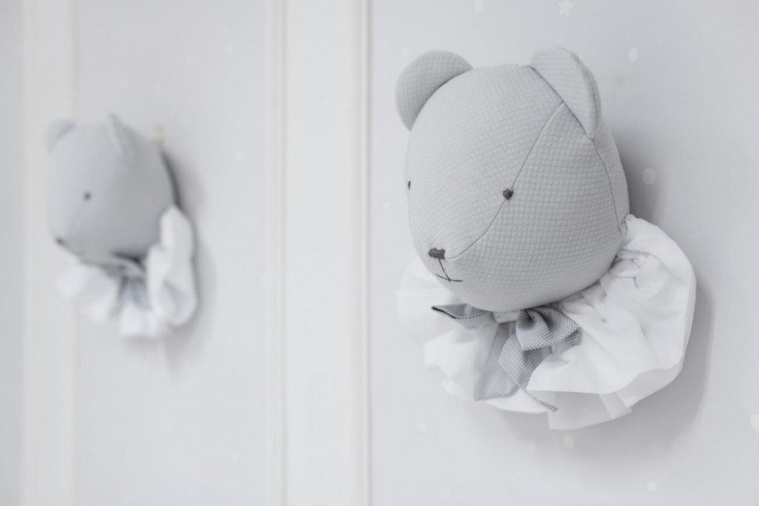 Una hermosa decoración de pared para la habitación de un niño: una cabeza de osito de peluche hecha a mano decorada con una gorguera y un lazo. El artículo tiene presillas para colgar.