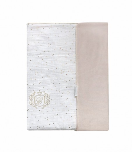 Una fina manta en suave terciopelo en un precioso color beige, forrada con muselina transpirable con lunares dorados. Decorado con un emblema dorado de la empresa y rematado con un inserto dorado. La manta será perfecta como regalo.