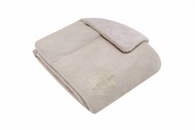 Una cálida manta de terciopelo en un bonito color beige. Desde abajo está hecho de tejido de felpa. Decorado con un emblema dorado de la empresa. La manta será perfecta como regalo.
