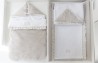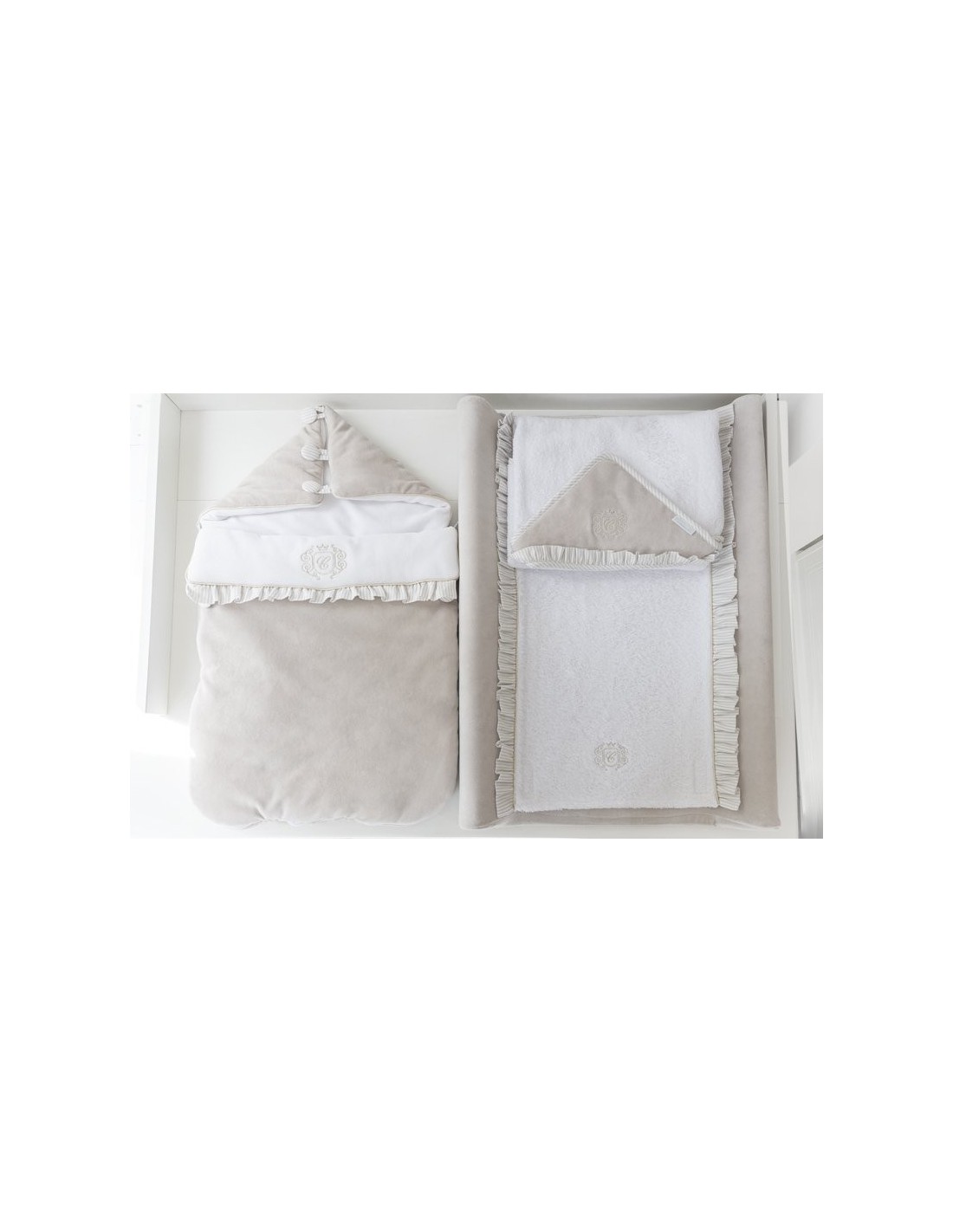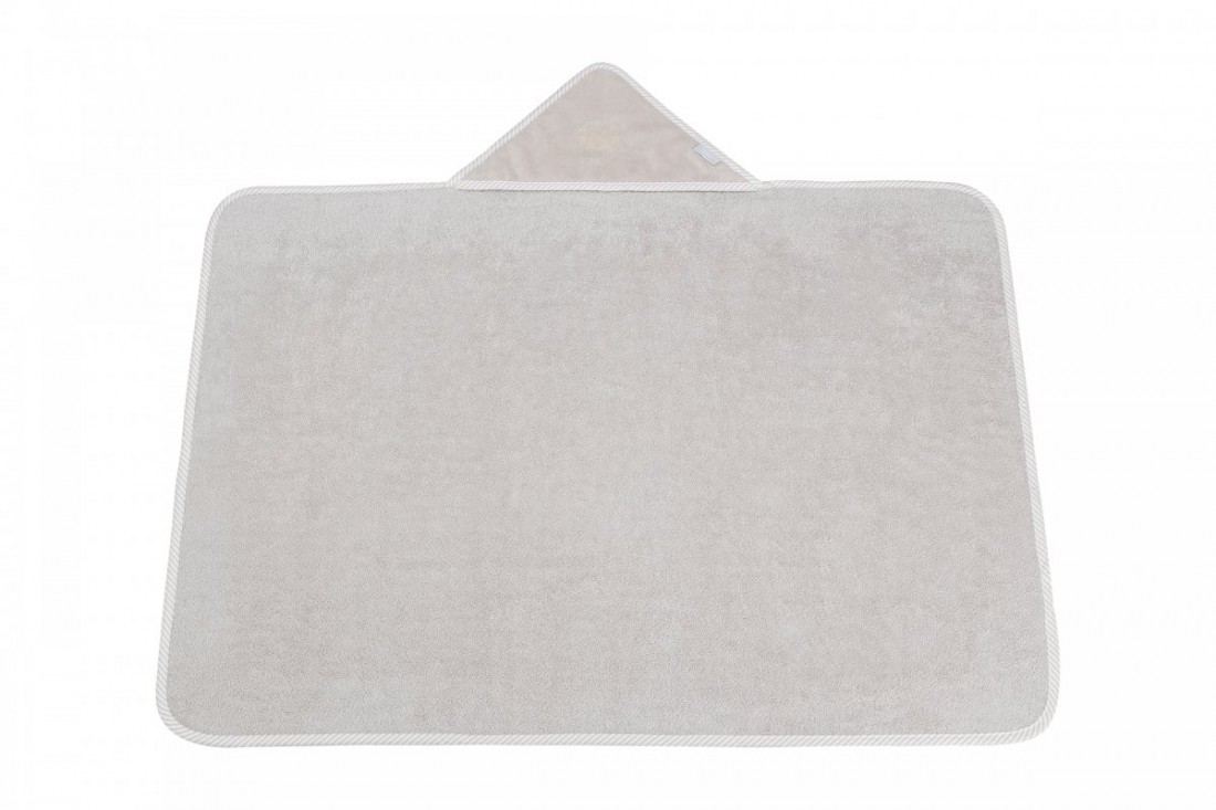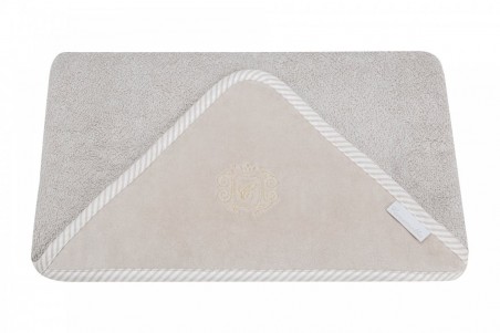 Elegante toalla en tejido de rizo color beige. La gorra de terciopelo beige está decorada con un elegante emblema dorado. El tamaño de la toalla es mayor que los disponibles generalmente en el mercado. Puede ser utilizado por un bebé pequeño y un niño mayor. Por eso lo usarás durante mucho tiempo. Perfecto para regalo.