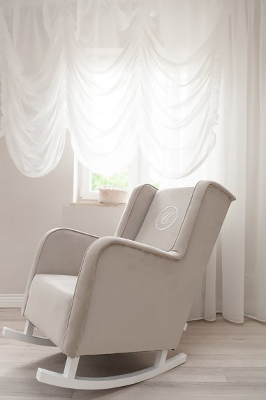 Una mecedora grande, muy cómoda, de estilo moderno, tipo "orejas", en textil lavable de alta calidad en color beige. El sillón está decorado con ribetes de cordón gris y un emblema exclusivo con la letra "C". Nuestra silla de lactancia será apreciada por todas las madres que amamantan debido a sus "orejas" y su respaldo alto. Además, enriquecerá cualquier interior: la habitación de los niños, el salón y otros.