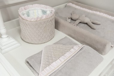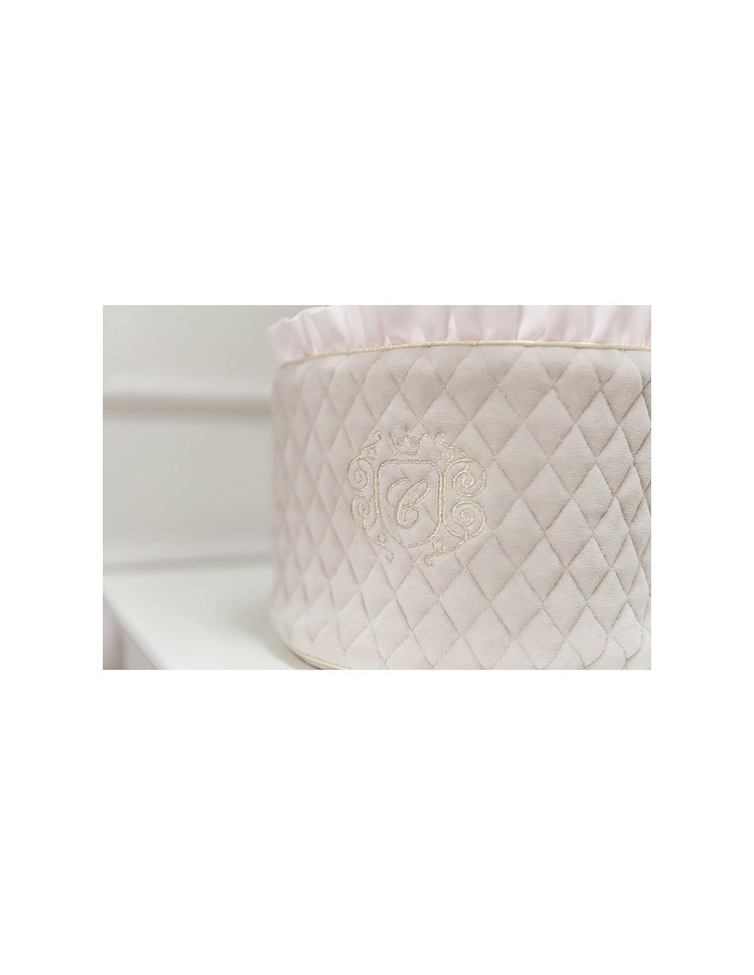 Cesta de productos redonda en terciopelo beige, decorada con un elegante bordado dorado y un precioso volante rosa. Se endureció con una esponja. Lugar ideal para guardar juguetes o accesorios de bebé.