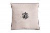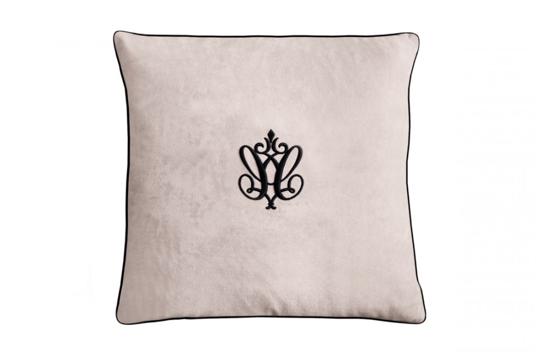 Adorable cojín de terciopelo beige decorado con canesú y bordado negro.