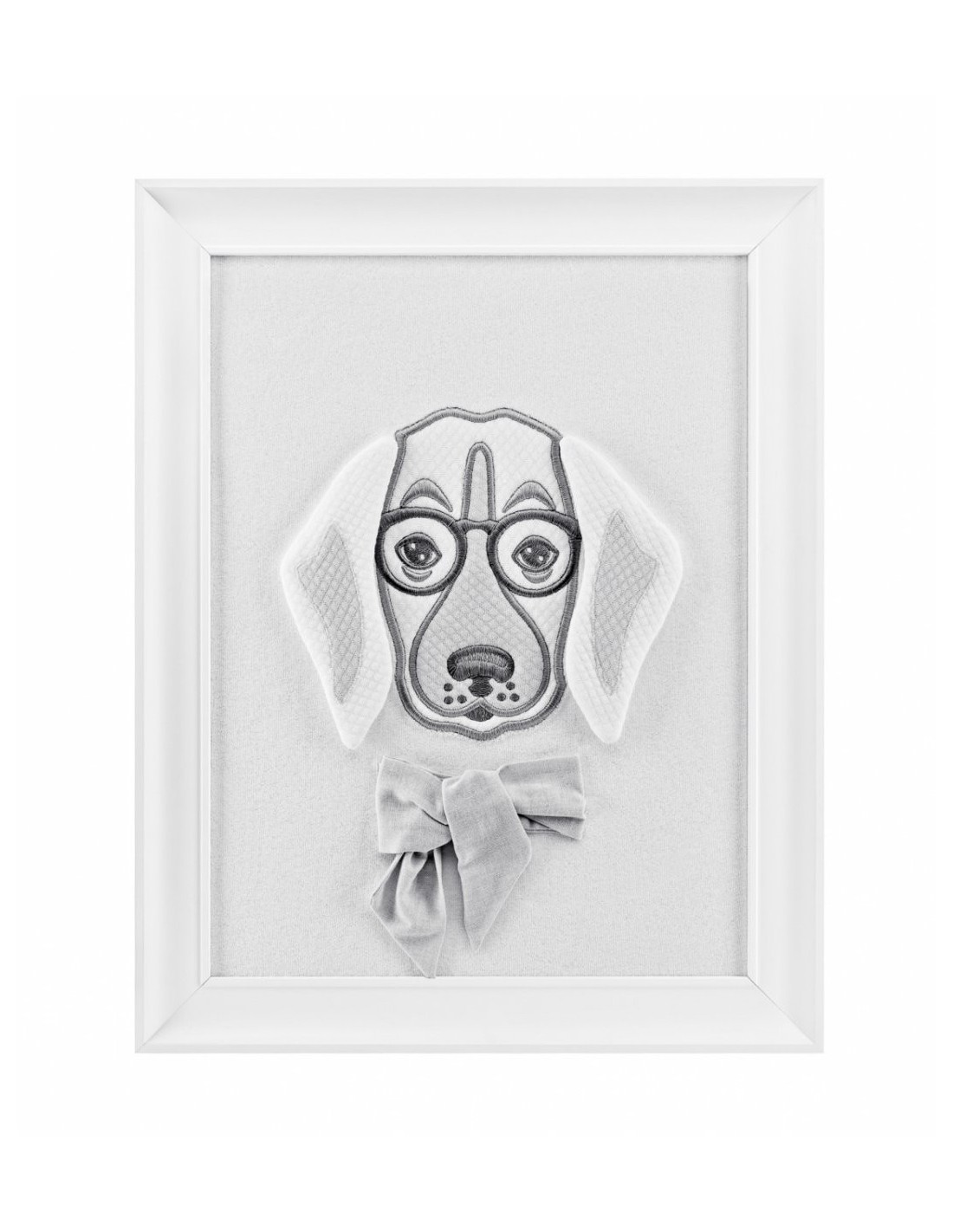 ¡Este magnífico marco decorativo consta de un fondo en tonos grises con su perrito que cuidará al bebé!