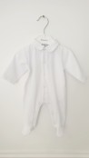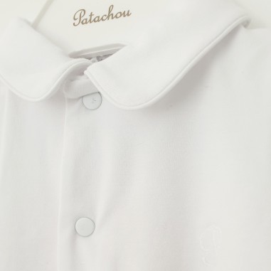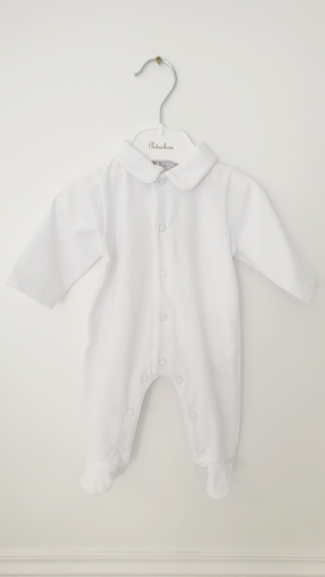 Su pequeño pijama de algodón de punto blanco con su pequeña placa blanca "P" en la parte delantera del pijama.