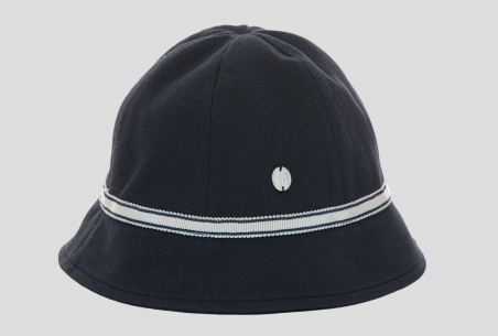 Magnífico sombrero en piqué azul marino con ribetes blancos.