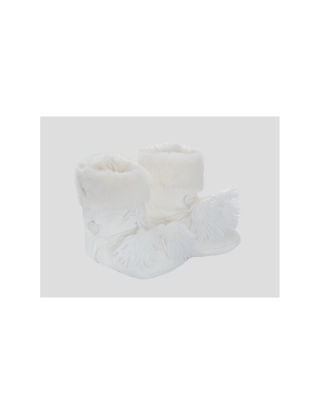 Trabajado en terciopelo acolchado color marfil con acabado de edredón y pompón.