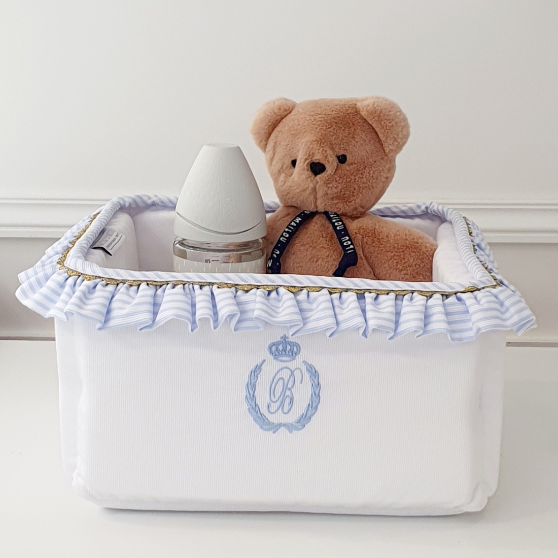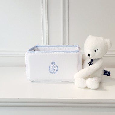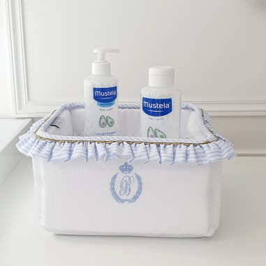 Le panier est à la fois décoratif et pratique, aussi bien pour les produits de soins que pour les dragées de naissance. Il dispose d'élastique à l'intérieures où vous pourrez y ranger biberons et autres produits.