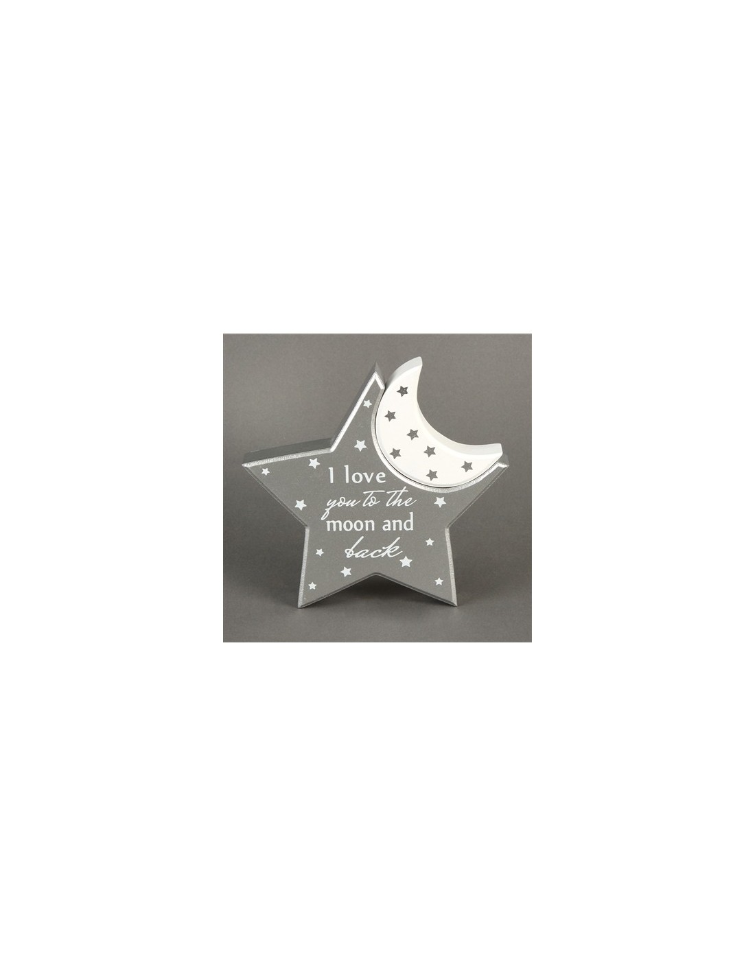 Cette petite étoile en gris et sa lune en blanche, sera une jolie décoration pour la chambre de votre enfant.