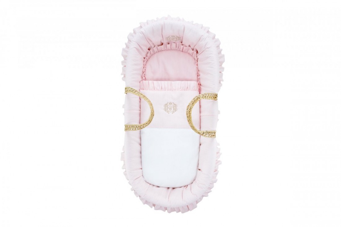Mini literie pour le couffin ou berceau. Fabriqué en coton satiné blanc et avec un panneau et un coussin en blanc-bébé rayures roses. Décoré avec un emblème de la compagnie d’or et fini avec un joli volant. La literie a un remplissage.
