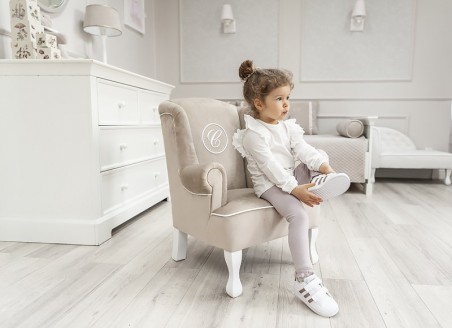 Un élégant fauteuil stylisé recouvert de textile lavable de haute qualité dans une couleur beige intemporelle. Décoré avec la lettre exclusive "C". Beaux meubles classiques qui enrichissent chaque chambre d’enfant.