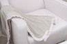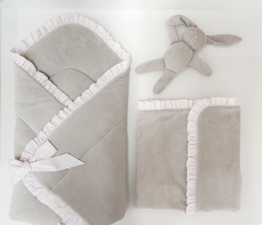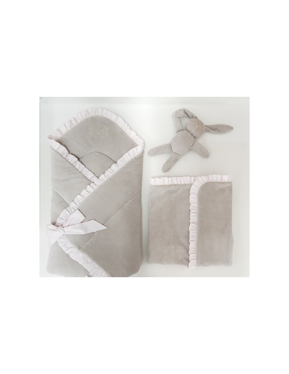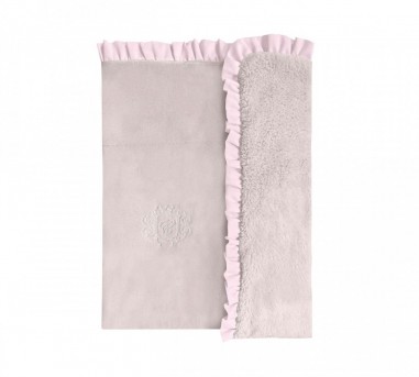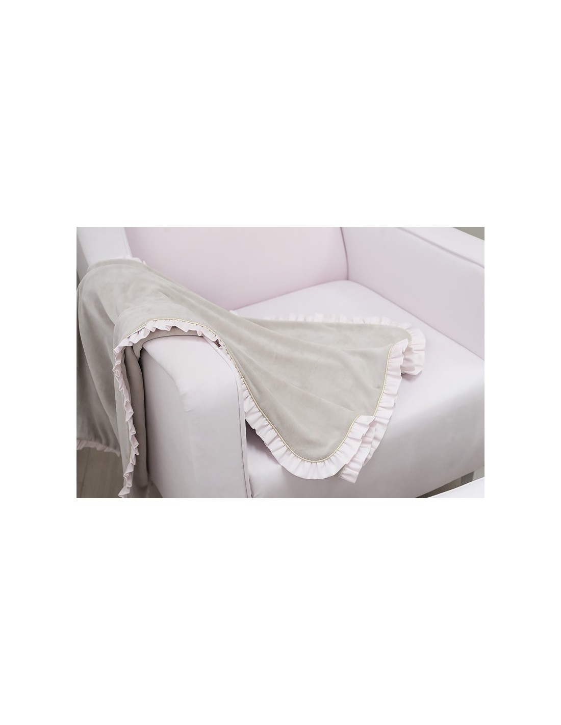 Couverture chaude de couleur beige sable en velours doux et textile peluche. Orné d'un emblème doré et d'un volant rose. La couverture sera parfaite comme cadeau.