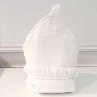 La sortie de bain est conçue pour accueillir et protéger au mieux le petit corps de bébé. La capuche de la cape de bain permet de bien essuyer sa tête, dès la sortie de l'eau, sans qu'il ne prenne froid.