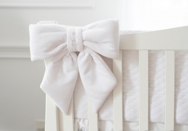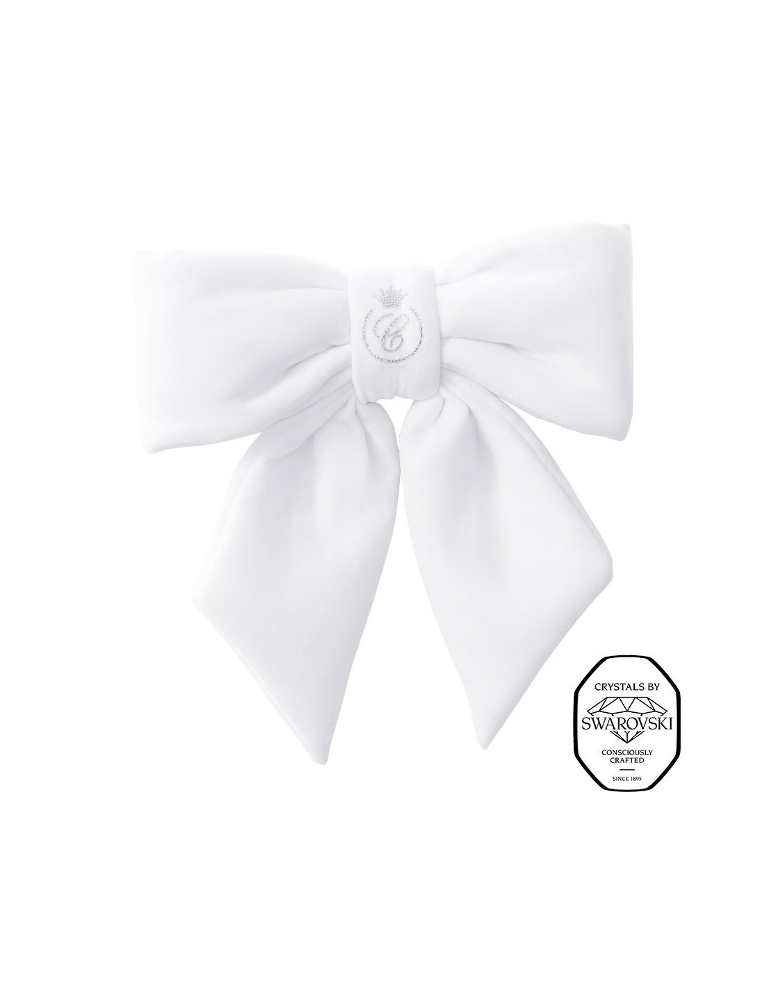 Nœud décoratif luxueux de taille XL décoré de cristaux Swarovski®. Fabriqué en velours de couleur blanche. Grâce au renfort, le nœud conserve toujours la forme parfaite. Des sangles pratiques permettent une fixation facile.