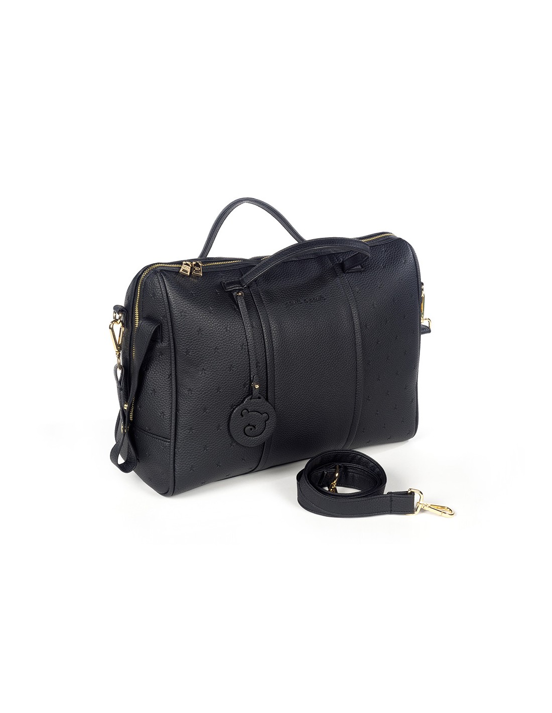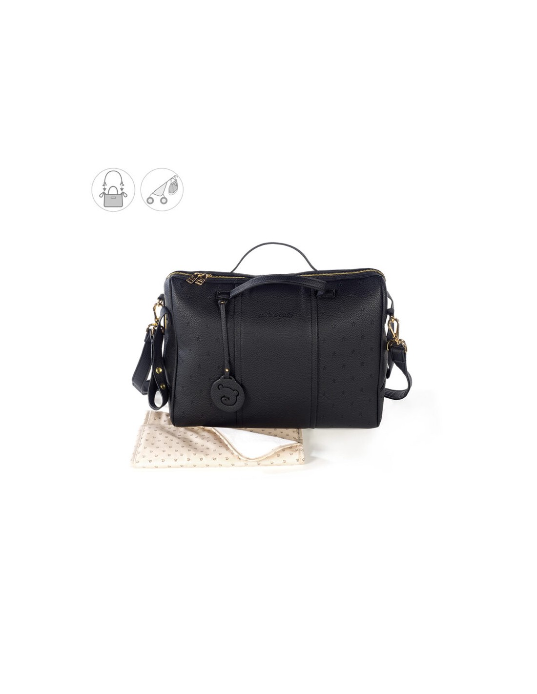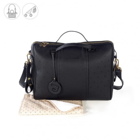 Sac à langer en simili cuir avec étoiles imprimées London. Sac à langer multifonctionnel. Il peut être utilisé non seulement comme sac à langer, mais est également entièrement adaptable à votre poussette. Longue sangle pour l’accrocher sur l’épaule et poignées courtes pour l’accrocher sur la poussette. Doublure intérieure avec plusieurs compartiments et poches pour transporter tout ce dont vous avez besoin pour votre bébé. Il a une poche interne plastifiée pour les vêtements mouillés. Les matériaux utilisés sont exempts de colorants azoïques, de phtalates et de substances nocives pour la santé.