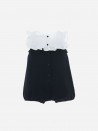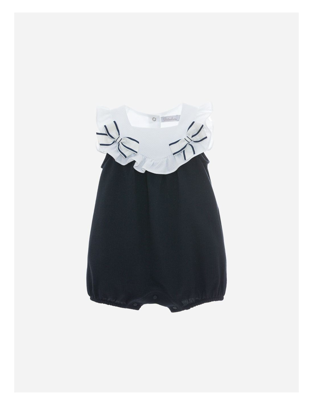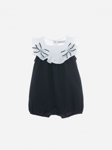 Cette barboteuse super ravissante est en piquet bleu marine. Elle est agrémentée d'un volant en piquet blanc sur la poitrine et de deux jolis nœuds assortis. La barboteuse se ferme avec des boutons pression entre les jambes et dans le dos pour un enfilage facile.