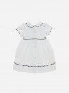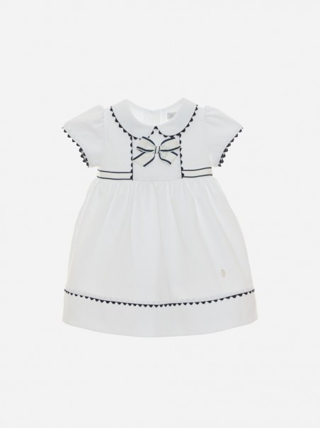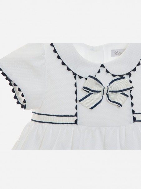 Confectionnée en piquet blanc, la robe est dotée d'une magnifique finition de galon bleu marine et est ornée d'un nœud assorti sur la poitrine. La robe est ample et froncée.